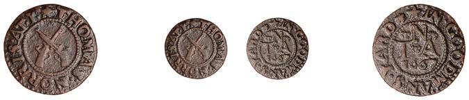 NORFOLK, Norwich,EdwardBuxton,Farthing,1653,1.20g/6h(N3139;BW.128);RobertClayton,Farthing,1663,0.96g/6h(N 3143;BW.132);RobertDuglas,Farthing,1.58g/6h(N3150;BW.139);EdwardHarding,Farthing,0.87g/6h(N3160;BW.151); EdwardHyrne,Farthings(2),0.99g/12h,0.87g/12h(bothN3165;BW.157);WilliamLambert,Farthing,0.69g/6h(N3167;BW.163); JohnLawrenceandL[aurence]Goodwin,Farthing,1658,1.25g/12h(N3168;BW.164);ThomasLong,Farthing,1657,0.91g/6h(N 3171 obv.,di erent rev.;BW.167);RichardMorant,Farthing,0.80g/6h(N3174;BW.172);FracisMorly,Farthing,0.87g/6h(N3175; BW.173);AnnMunford,Farthing,1.14g/12h(N3176;BW.174);ThomasNewman,Farthing,1.21g/12h(N3179;BW.176)[13].