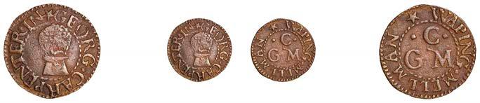 Duplicates: Wapping, John Broughton, Farthing, 1650, 0.94g/10h (N –; BW. 3282); Andrew Coleman, Halfpenny, 1.68g/12h (N 8525; BW. 3290); Thomas Peirce, Farthing, 0.97g/6h (N 8517; BW. 3325); William Redding, Farthing, 1663, 0.62g/12h (N 8520; BW. 3334); Francis Richardson, Halfpenny, [16]66, 1.39g/12h (N 8521; BW. 3336); Thomas Thekeston, Halfpenny, 1668, 1.06g/3h (N –; D 3346A); E.M.V. AT THE 3 DETHES HEDES, Farthing, 1.13g/6h (N 8542; BW. 3347) [7]. Varied state £70-£90