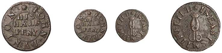 Duplicates: Whitechapel, John Carter, Farthing, 0.90g/6h (N 8590; D 3394A); John Case, Farthing, 1656, 0.93g/6h (N 8591; BW. 3395); I.E.F. THE TOBACKE ROVLD AND HOVP, Farthing, 0.85g/6h (N –; BW. 3404); John Skinner, Halfpenny, 1668, 2.21g/9h (N –; BW. 3423); John Wood, Farthing, 0.38g/6h (N 8603; BW. 3430) [5]. Varied state £40-£60
