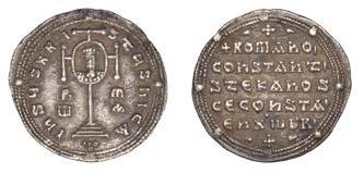 ConstantineVIIPorphyrogenitus with RomanusI,Miliaresion,Constantinople,931-44,largecrosspotentonsteps,over centre medallion containing portrait, rev. legend in !ve lines, 2.83g (DOC 20; Sear 1755). Very !ne £150-£200