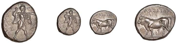LUCANIA, Poseidonia,Nomos, c. 420-410,Poseidonstandingright,castingtrident,chlamysdrapedovershoulders, Η behind, rev. bullstandingleftonpelletedandbeadedexergueline,Ibelow, ΠΟΣΕΙΔΑ above,7.78g(HN Italy 1127;Pozzi–; cf. McClean1069; SNG ANS 678). Struck from a slightly worn obverse die, otherwise good very !ne, and beautifully toned, the reverse pleasing £300-£400