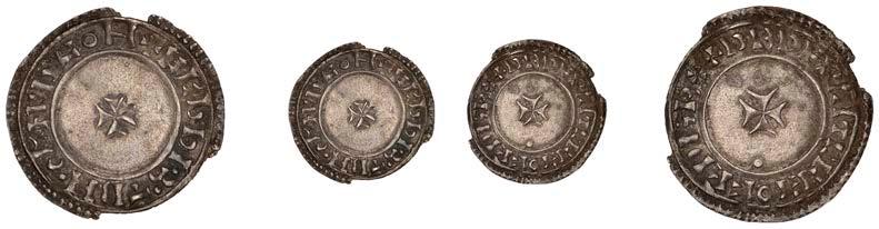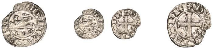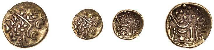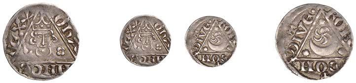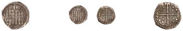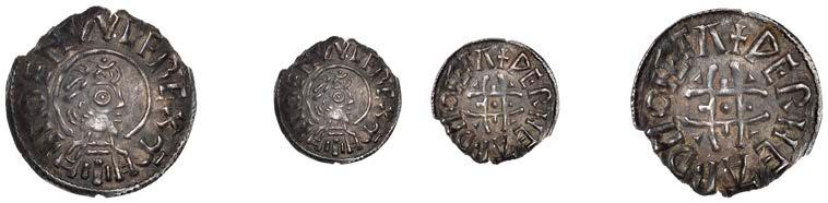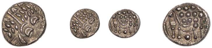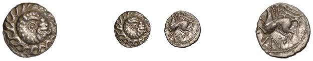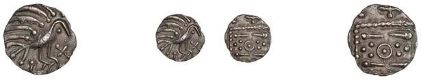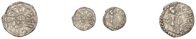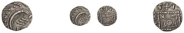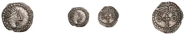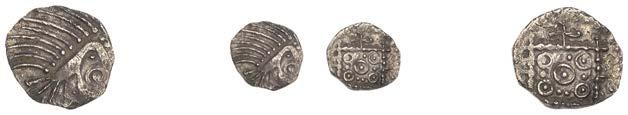 Sceattas (4), Primary series F, head right with pelleted helmet, rev. small cross, pellets and annulets in angles, 1.13g/12h (SCBI Abramson 103ff; Abramson 106.20; N 62; S 781); Continental series E, porcupine-like !gure, rev. standard with TT II and pellets around central annulet, 0.88g (SCBI Abramson 244; Abramson 94.10; N 45; S 790); Secondary series J, type 37, two heads vis-àvis, cross between, rev. whorl of four birds in linear style around central cross, 1.10g/12 (SCBI Abramson 386-9; Abramson 19.30; N 135; S 802A); Secondary series, Celtic Cross type 23/34b, bird walking right, rev. Celtic cross, rosette in each angle, 0.90g/1h (SCBI Abramson 519; Abramson 29.20; N –; S 822) [4]. Second with several surface chips, otherwise "ne, last very rare £150-£200