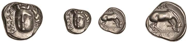 EarlyUninscribedissues,Quarter-Stater,North-WesternQctype,WesternWheelclass1,wreathdesign, rev. triple-tailed horse right, spiked mane, !oral sun above, wheel below, 1.25g (Sills 220 var.; ABC 503 var.; BMC –; VA 220 var.; S 48). Very !ne £400-£500