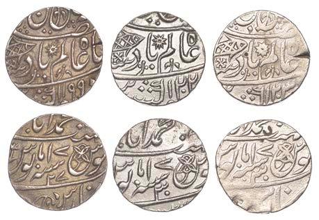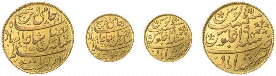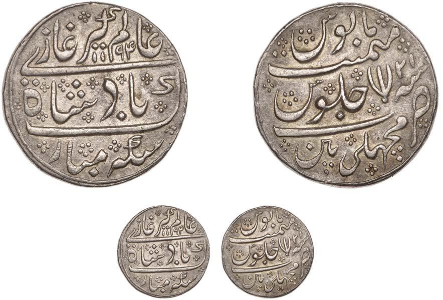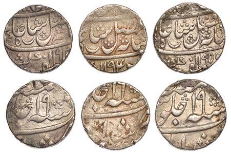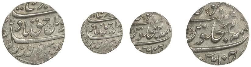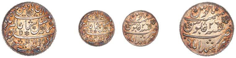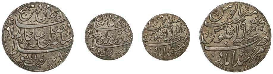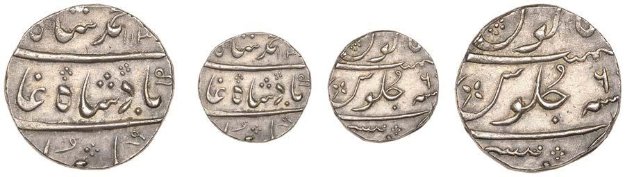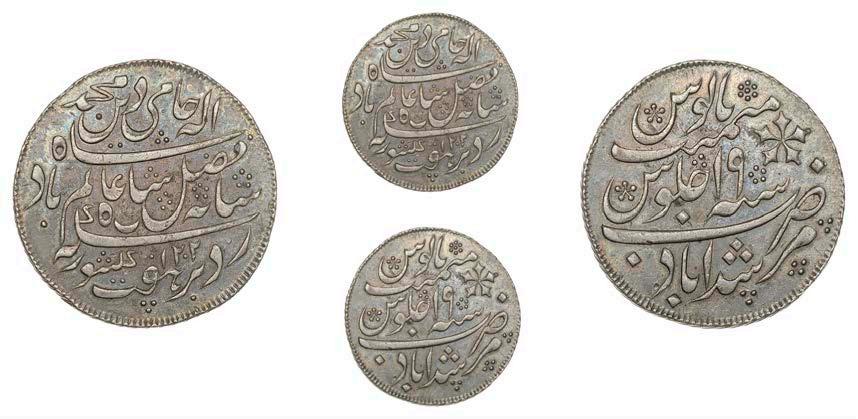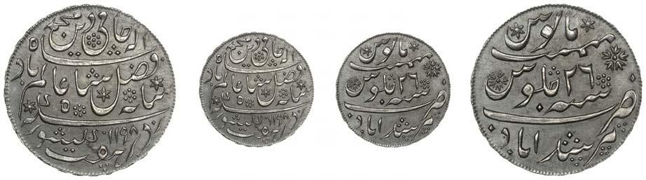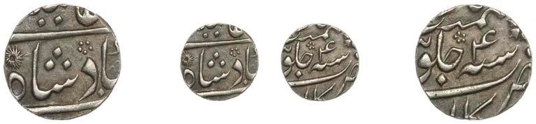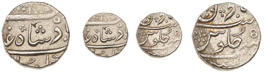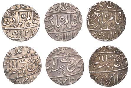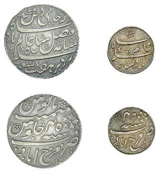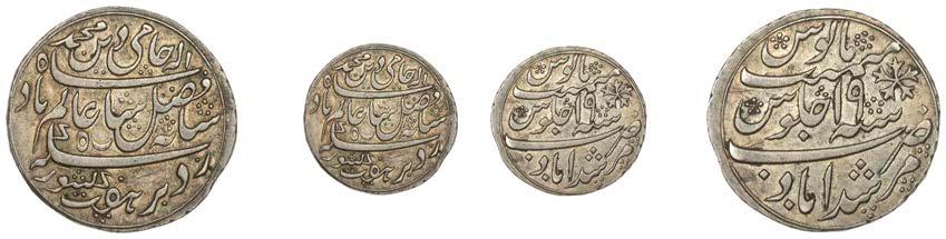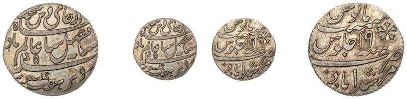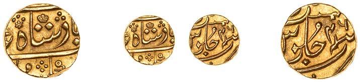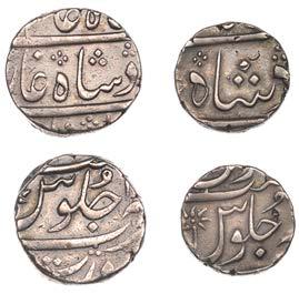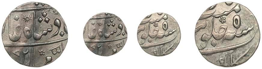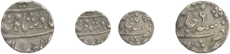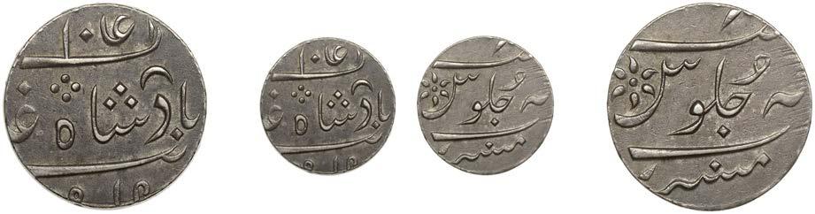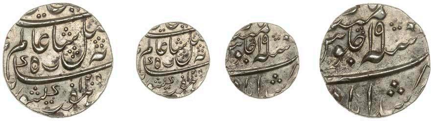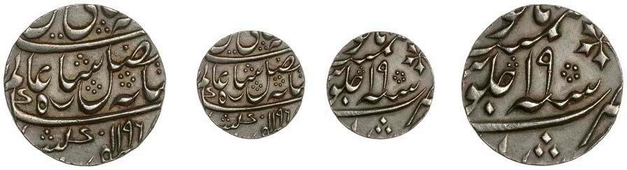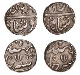 •The Farrukh Siyar and Muhammad Shah quarter-rupees struck from specially prepared dies (Lots 72-73) are special coins containing the complete legends.