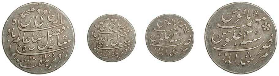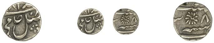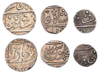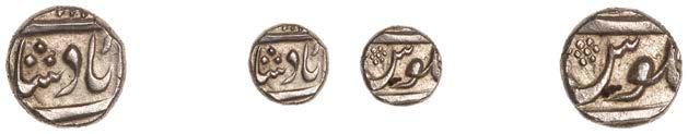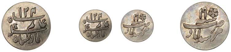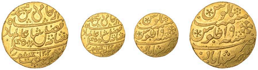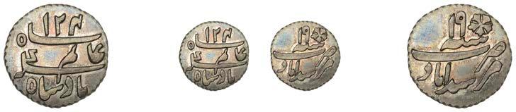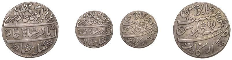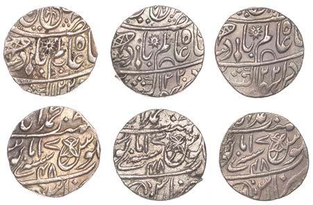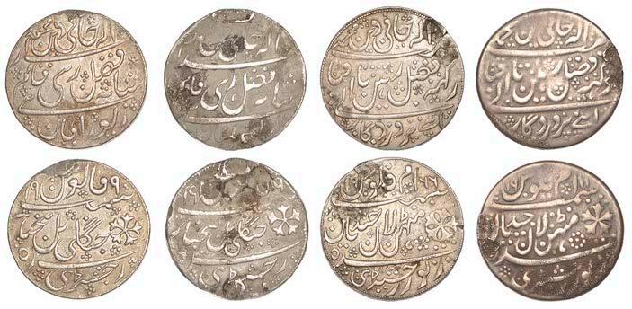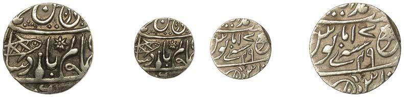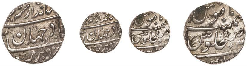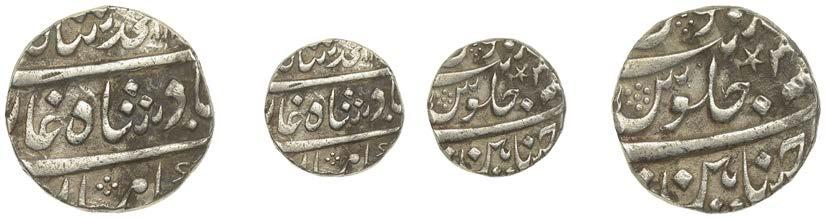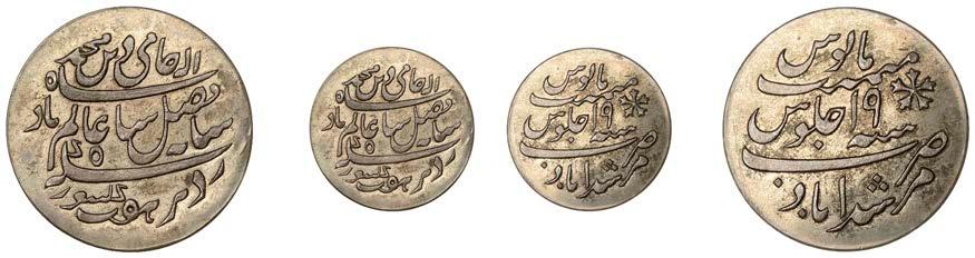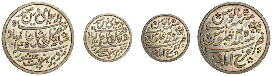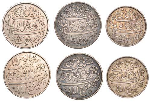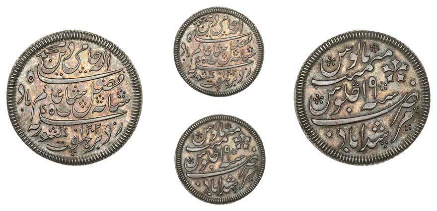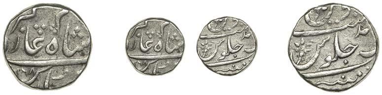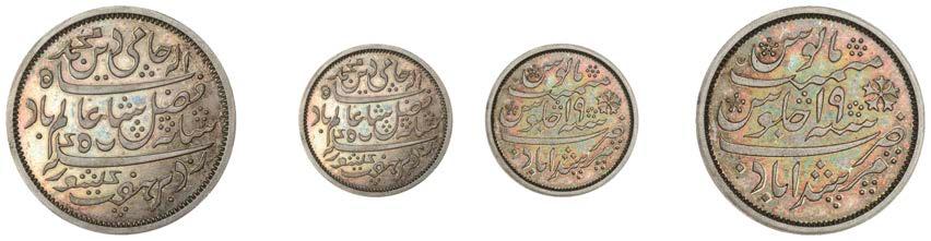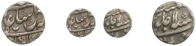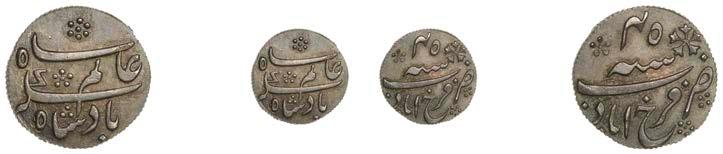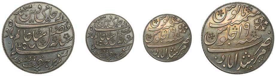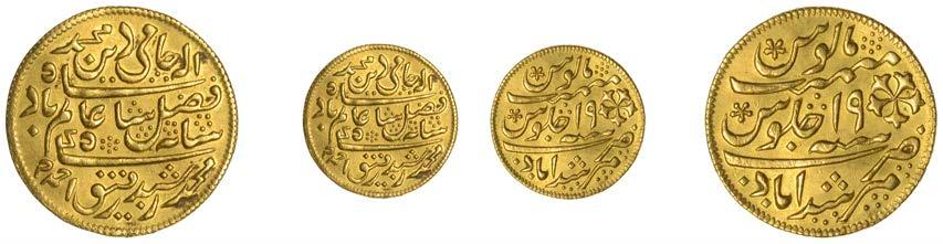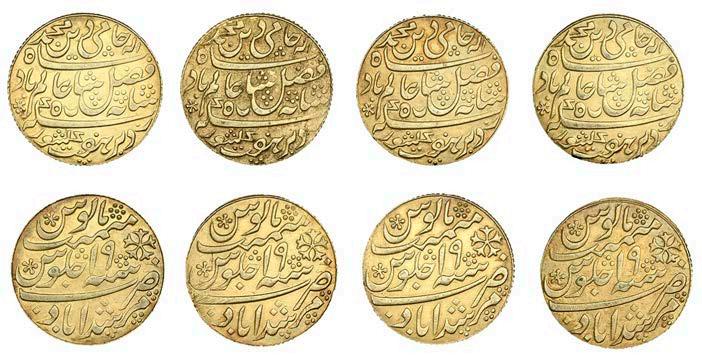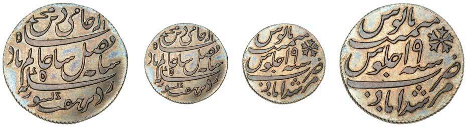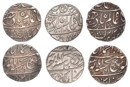 •The Farrukh Siyar and Muhammad Shah quarter-rupees struck from specially prepared dies (Lots 72-73) are special coins containing the complete legends.