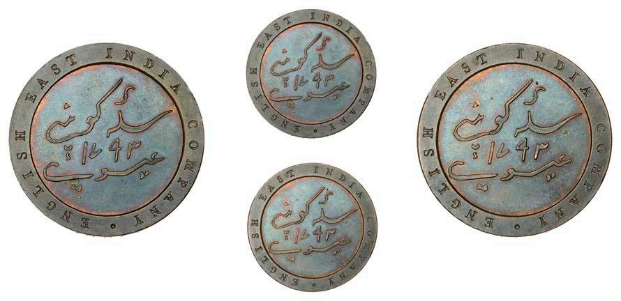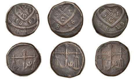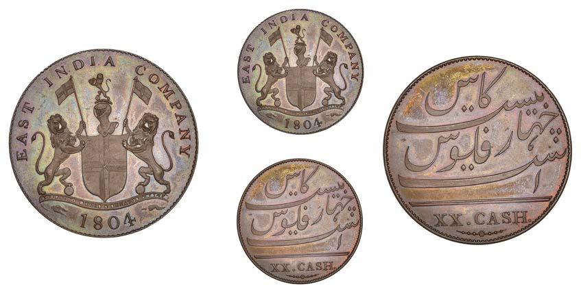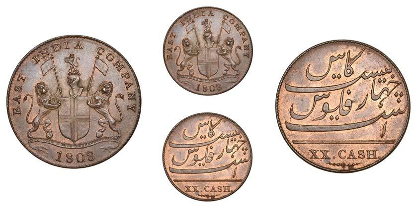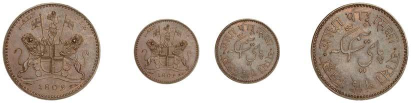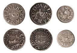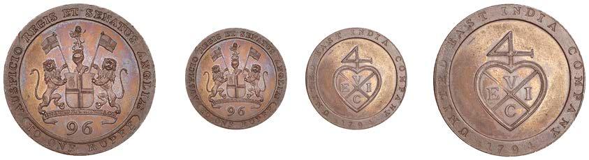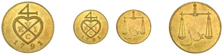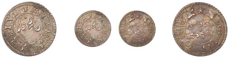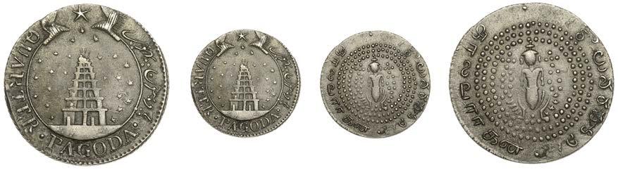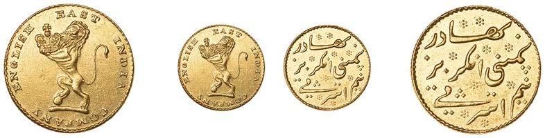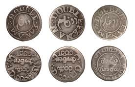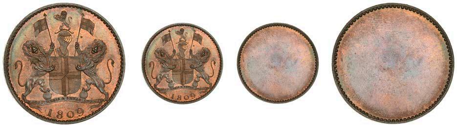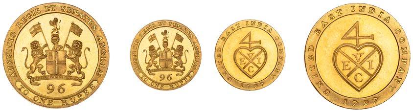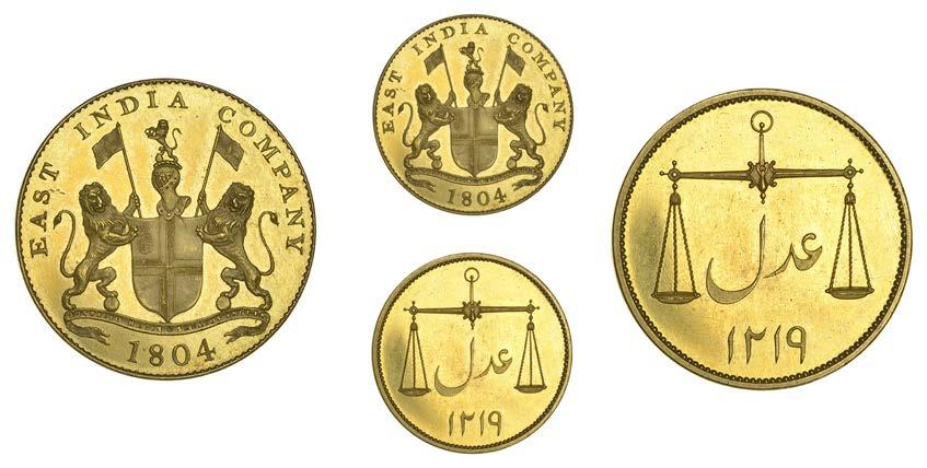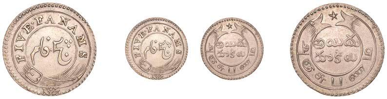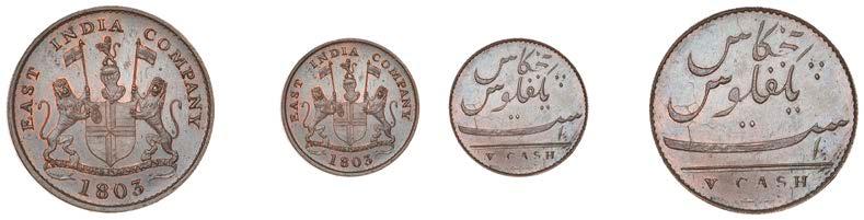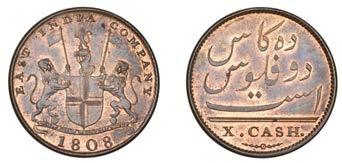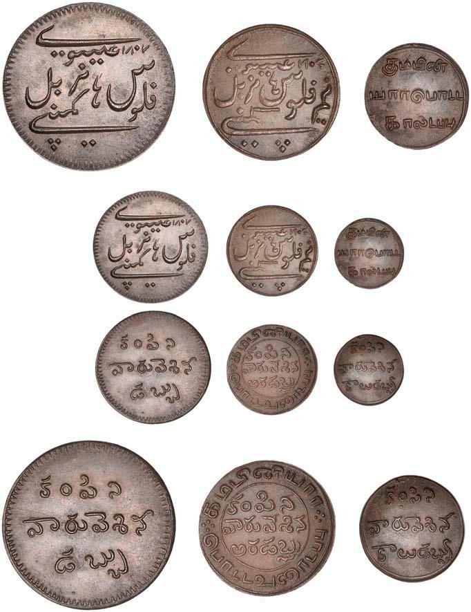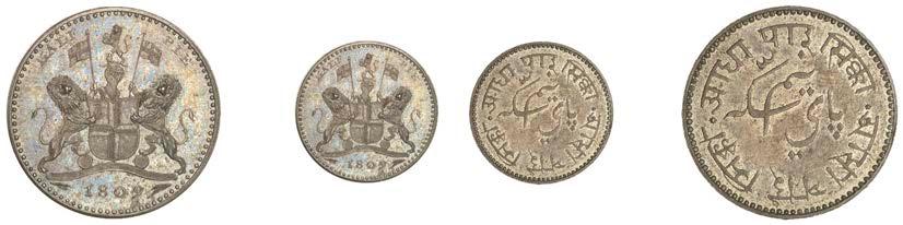 •The Pridmore/Wheeler mint specimen 1807-8 set of minor denominations, ve fanams, double-fanam and fanam (Lot 101) and the ve-piece mint specimen 1808-12 issue from half-pagoda to fanam (Lot 108). These exceptionally rare sets have only come onto the market every 20 years or so, thus a collector must be nimble.