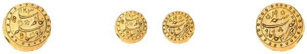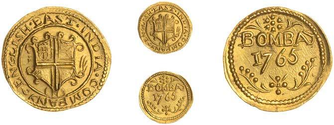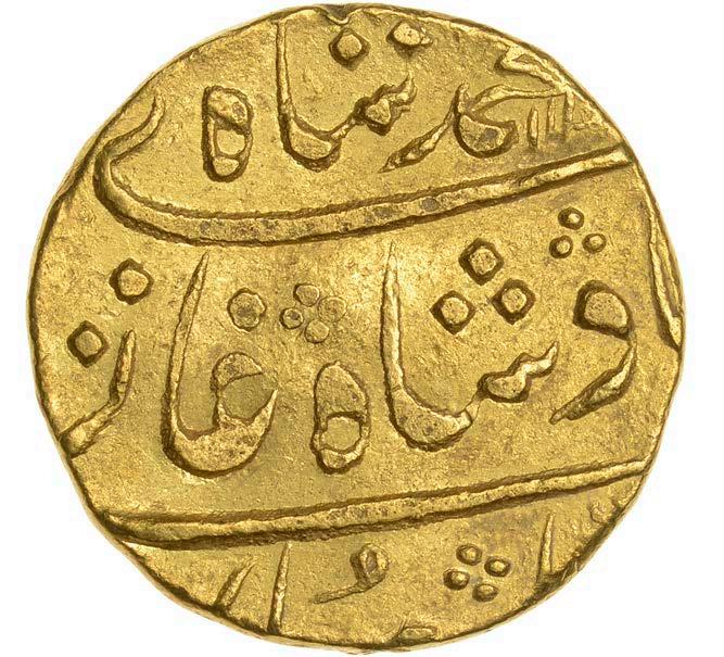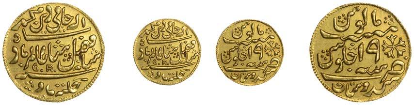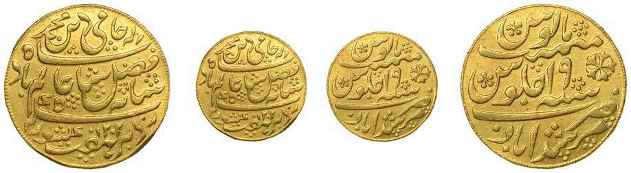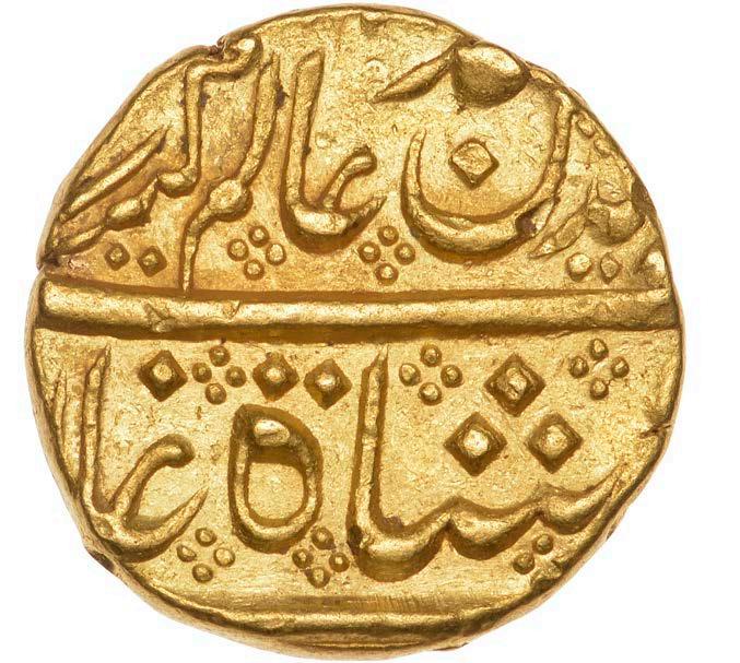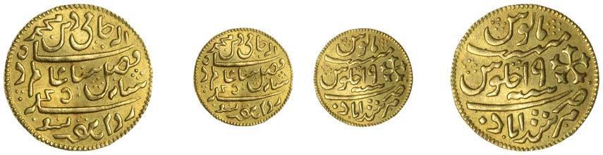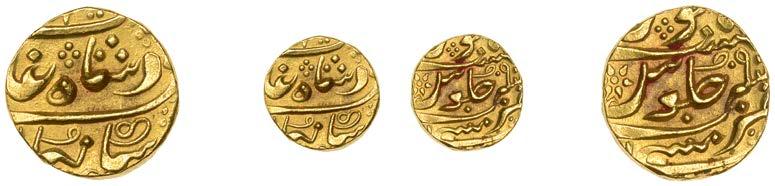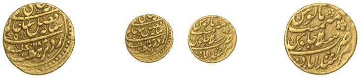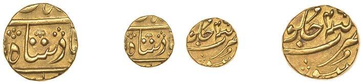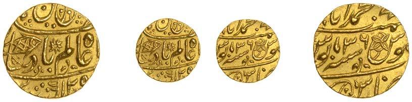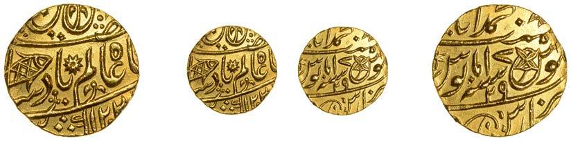 • The Mughal type series of Alamgir II consisting of the mohur (large gold rupee), third-mohur (gold rupee or panchia) and fteenth-mohur or small gold rupee (Lots 317-319), struck at Mumbai about ten years after the 1765 mohur series. They are very di cult to nd but I nally located three of the four coins in the 1990s. The half gold rupee has never been traced.