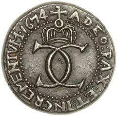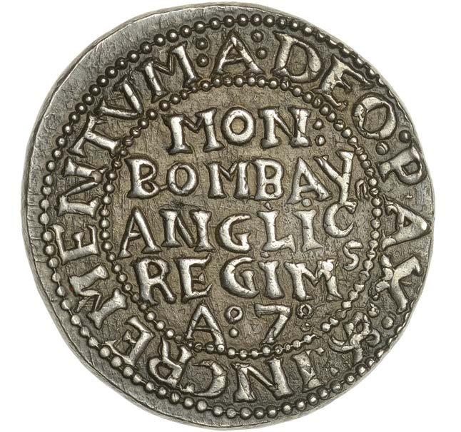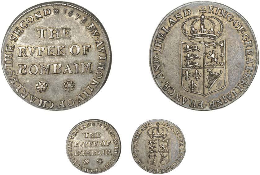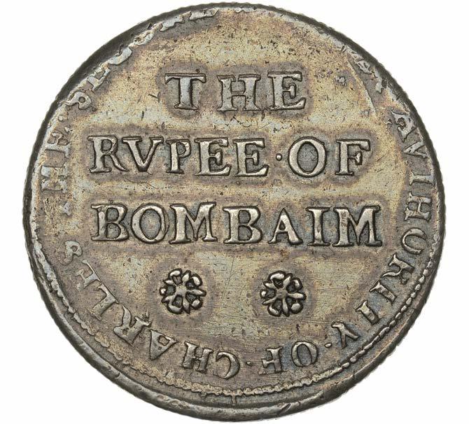 • It was a treat to own both rupee of Bombaim patterns, the 1677 Bombay London-struck pattern rupee (the only one in private hands) (Lot 324) and the extremely rare 1678 Bombay London-struck pattern rupee (Lot 325). Both were bought in London auctions in early 1986 with wonderful provenances. From the Brand auction I also obtained the pewter trial rupee of Bombaim (Lot 326). I also own two Bombaystruck rupees of Bombaim, one obtained from the Pridmore collection (Lot 328) and the other from Baldwin’s in 1985 (Lot 327). The period 1982-86 was, indeed, a most wonderful time to be a collector of E.I.C. coins.