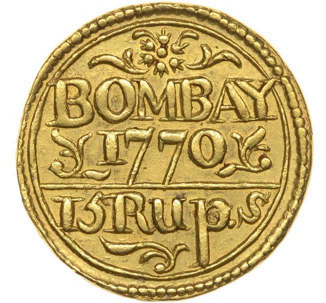 • The Bombay gold 15 rupees, 1770, a spectacular coin (Lot 316). I did not have the means to buy this coin at the ‘Skanda’ sale in 1991 but traced it and obtained it eight years later from a dealer. It appears to me to be the most attractive and highest grade of the few known specimens.