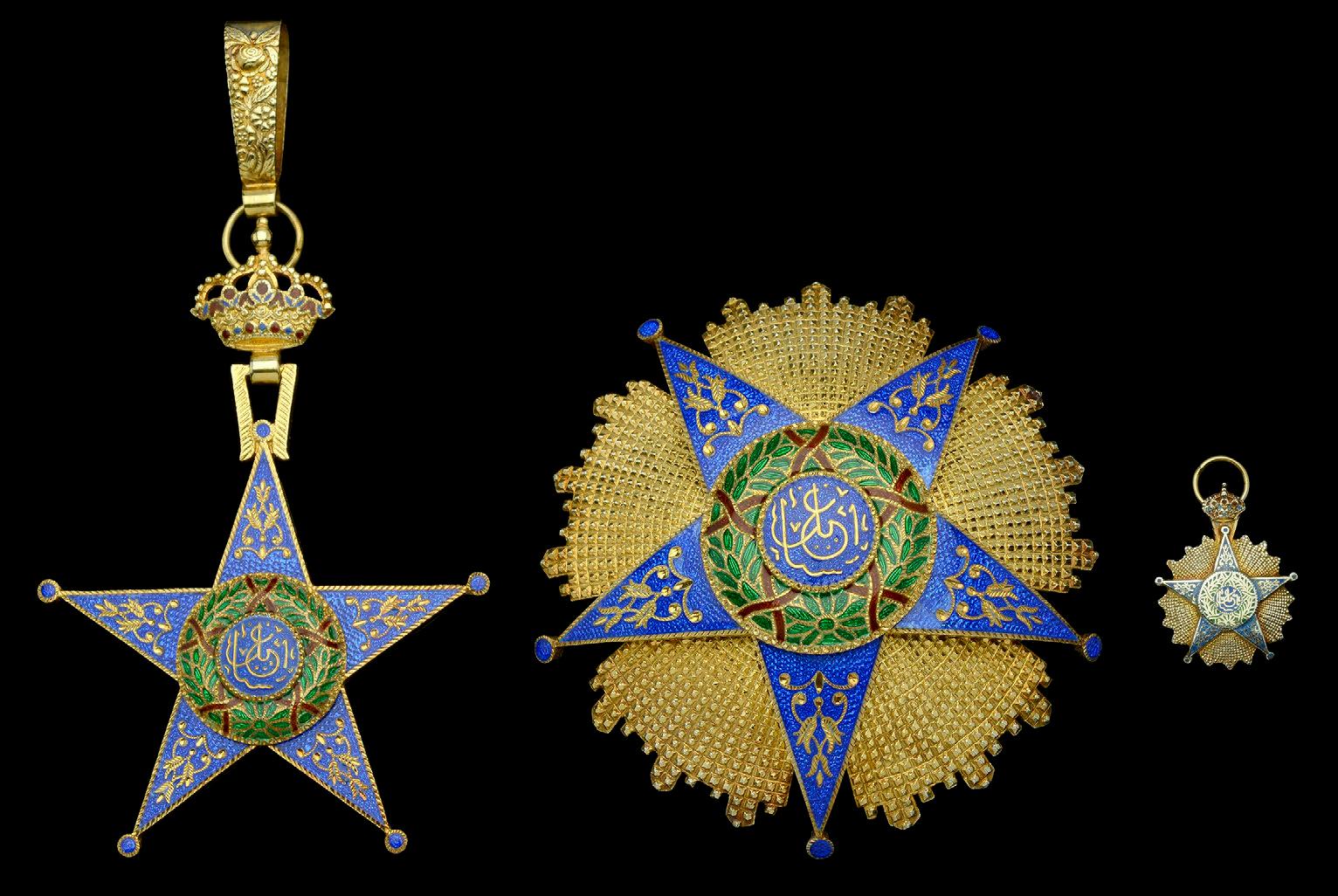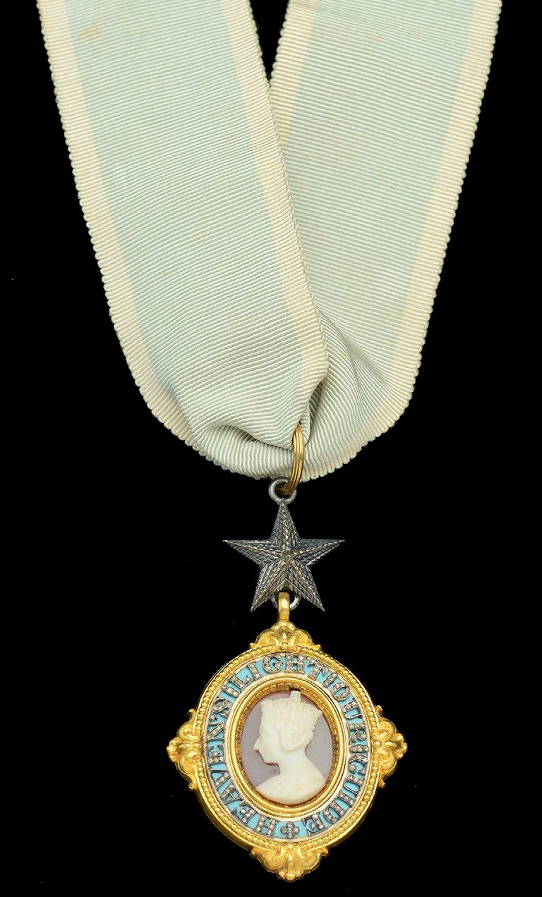 The Most Exalted Order of the Star of India, C.S.I., Companion’s neck badge, gold and enamel, with central onyx cameo of a youthful Queen Victoria, the motto of the order set in rose diamonds, suspended from a fve-pointed silver star and gold ring suspension, with full and miniature width neck ribands, in Garrard, London, case of issue, a perfect badge, extremely fne £4,000-£5,000