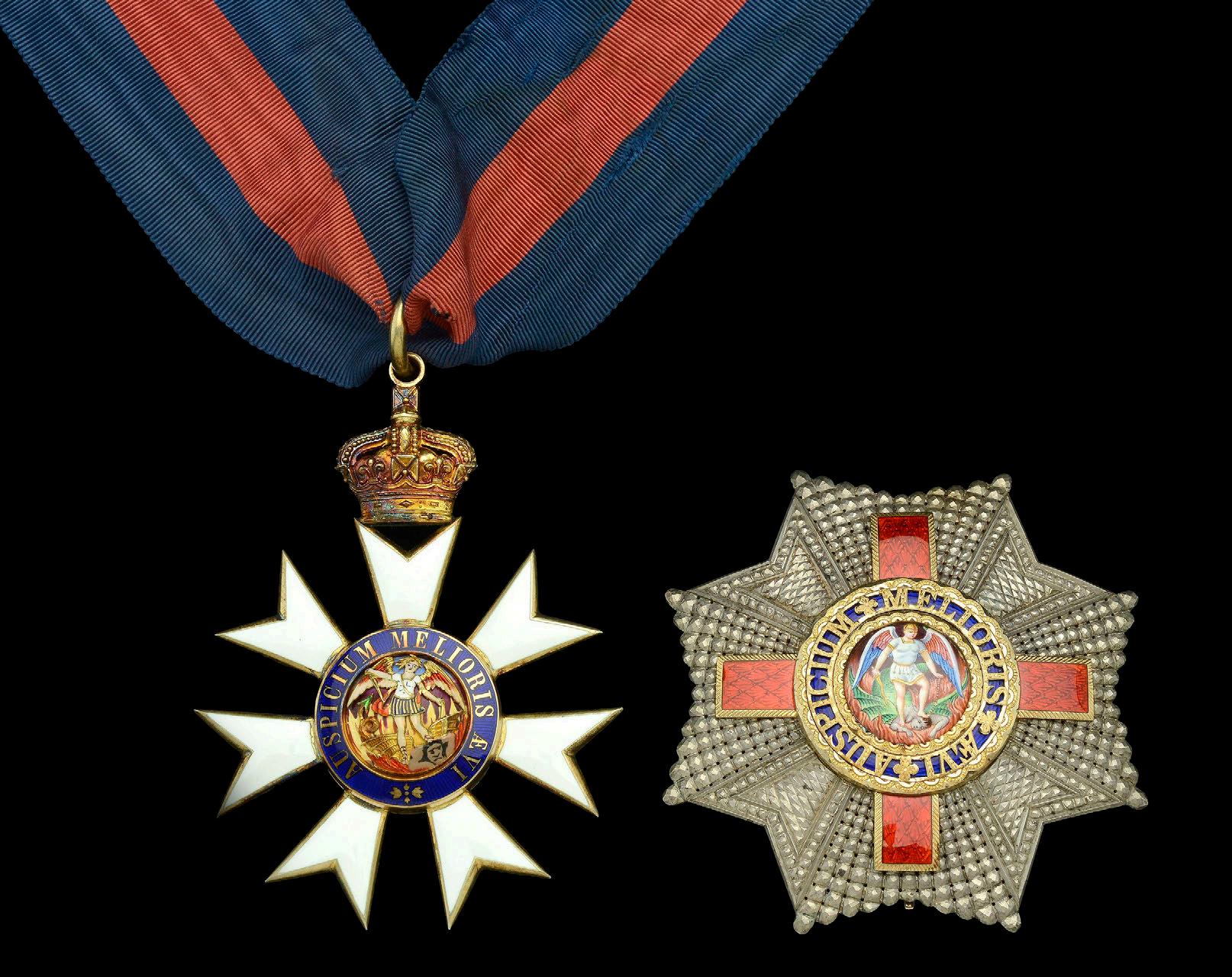The Most Distinguished Order of St. Michael and St. George, K.C.M.G. Knight Commander’s late 19th century set of insignia, comprising large size neck badge, 100mm excluding ring suspension x 72mm, silver-gilt and enamels, and breast star, 90mm diameter, silver with appliqué centre in gold and enamels, with gold pin for wearing, complete with fll neck cravat with silver-gilt retaining clasp (separate), in Garrard & Co , 25 Haymarket, London, ftted case of issue, some damage to reverse fgure of St George and dragon, otherwise about extremely fne (2) £1,400-£1,800