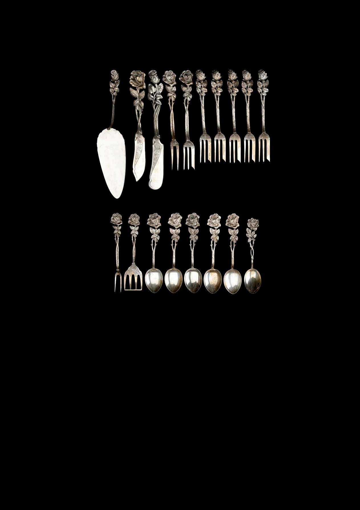 A SMALL COLLECTION OF CONTINENTAL DECORATIVE FLATWARE, the handles cast with two variants of rose blooms, comprising six pastry forks, six tea / ice cream spoons, two butter knives, two pickle forks, a small server and a pie slice, each piece stamped ‘835’. (18) £120–£150