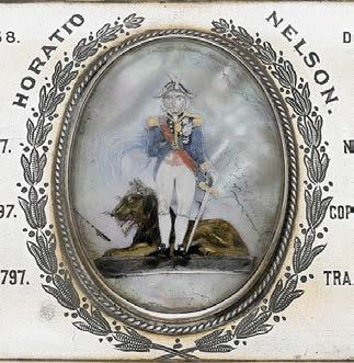 PIN TRAY, centred with a reverse painted rock crystal cabochon of the admiral in full uniform, the British lion at his feet, on a mother-of-pearl ground, the tray engraved with the dates of Nelson’s principal naval battles, the reeded border cast at intervals with laurel leaves, by William Comyns, London 1905, length 11.5cm. £700–£1,000