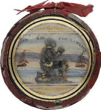 458 A GEORGIAN ANTI-SLAVERY PINCUSHION, LATE 18TH/EARLY 19TH CENTURY, the circular cushion in red silk with bow atop, the glazed panel depicting an enslaved black man, kneeling, in chains and shackles, the image applied to a painted ground depicting two slave ships ying red ags beneath the motto ‘Thank God for Liberty’, with mirrored base, diameter 47mm. £1,000–£500