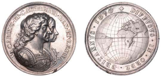 British Colonization, 1670, a silver medal by J. Roettier, conjoined busts of Charles II and Catherine right, rev globe, 42mm, 34.53g (MI I, 546/203; Betts 44; E 245). Minor rim nicks and bright from past cleaning, otherwise good very ne