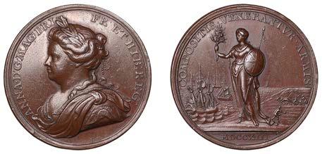 CaptureofBéthune, StVenantandAire,1710,acoppermedalbyJ.CrokerandS.Bull,laureateanddrapedbustofAnneleft, rev. large trophy of French arms and standards on plinth, 48mm, 41.19g (MI II, 374/220; E 447). Brilliant and virtually as struck £150-£200