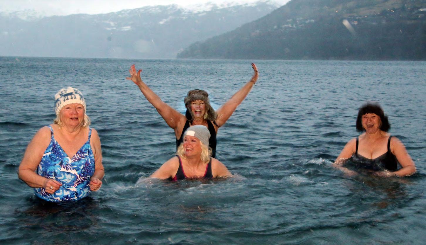 Stavenesvikja i Stryn står fire damer og kler av seg. På med badedrakt, høveleg fottøy (dykkarsko, badesko eller ullsokkar) og ei solid lue så er dei klare. Og ut i vatnet ber det, med plasking og jubel.