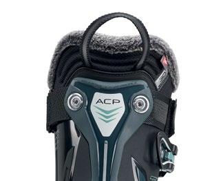 A constant analysis on legs and anatomy led us to achieving important goals in differentiating not only products, but even technologies between men and women skiers. With ACP, we designed a dedicated shape which better accommodates women’s lower legs. In women product, our team has also developed a different system, which is fixed with only one screw to the cuff (men version have two screws) that allows a more natural flex and stiffness based on women’s average power and needs.