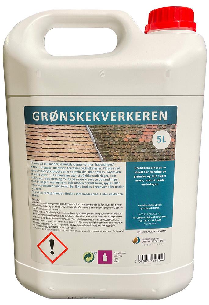 Påføres ved hjelp av lavtrykksprøyte eller sprayflaske. Ikke spyl av. Grønsken er borte etter 1-3 virkedager.