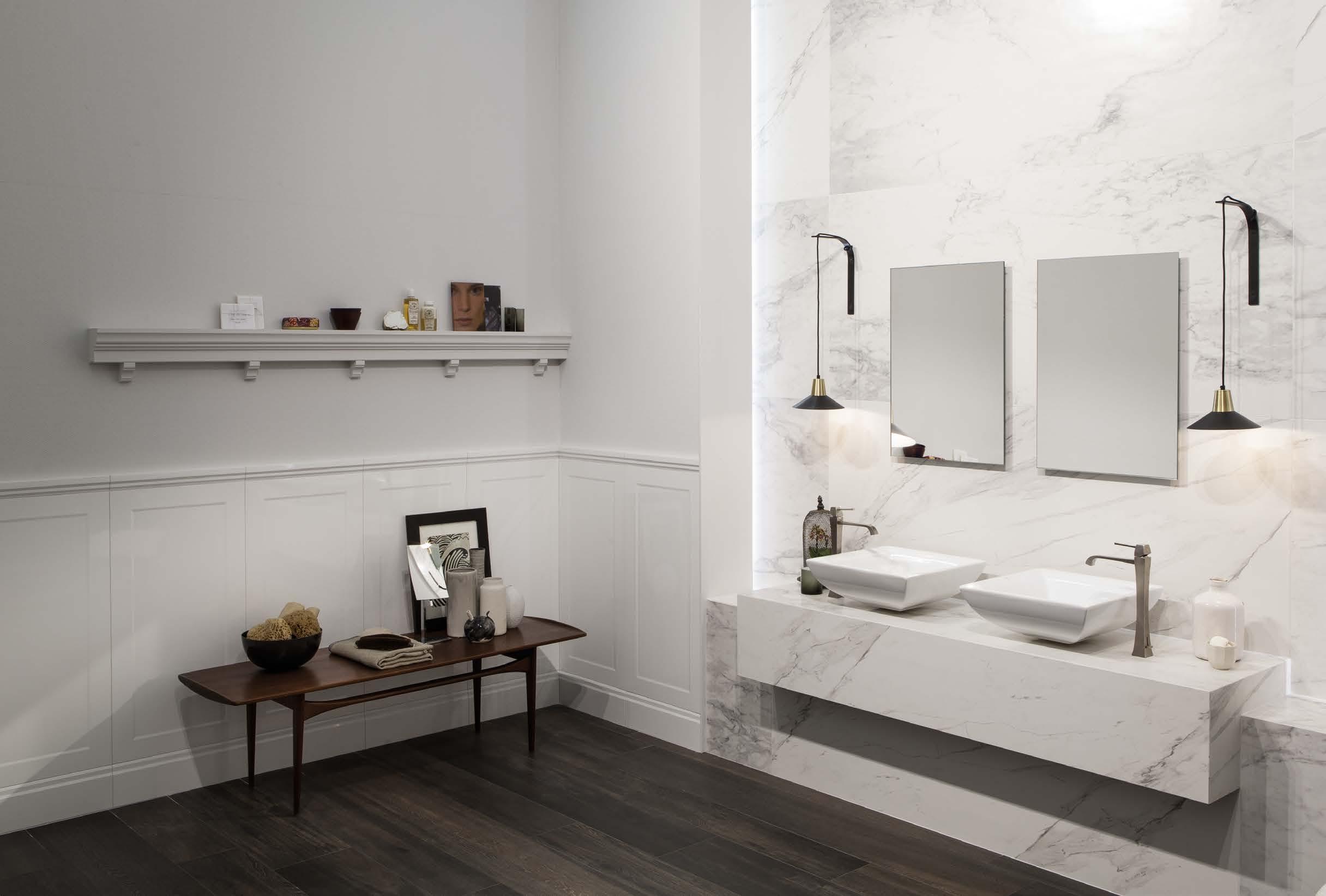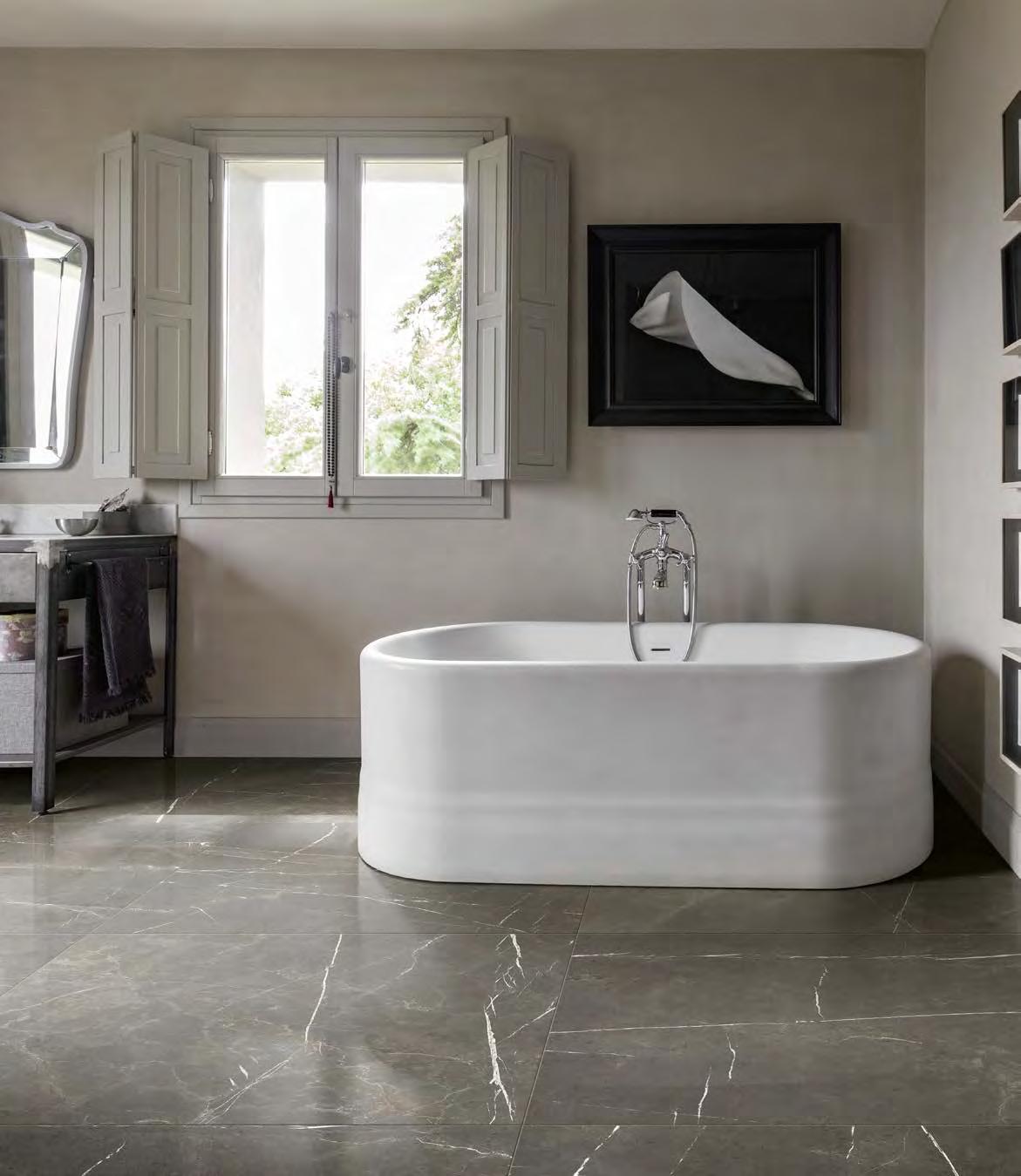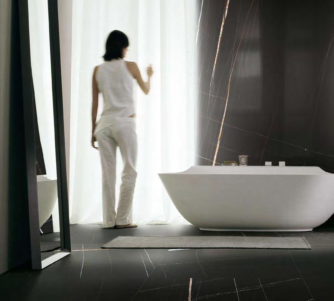 Una raffinata selezione di pietre e marmi, un immaginario viaggio fra le suggestioni di luoghi diversi per raccogliere 8 fonti ispirative dal perfetto equilibrio cromatico. Forme essenziali e accostamenti vintage raccontano una storia attraverso superfici profondamente diverse in cui il filo conduttore è la stessa filosofia di eleganza.