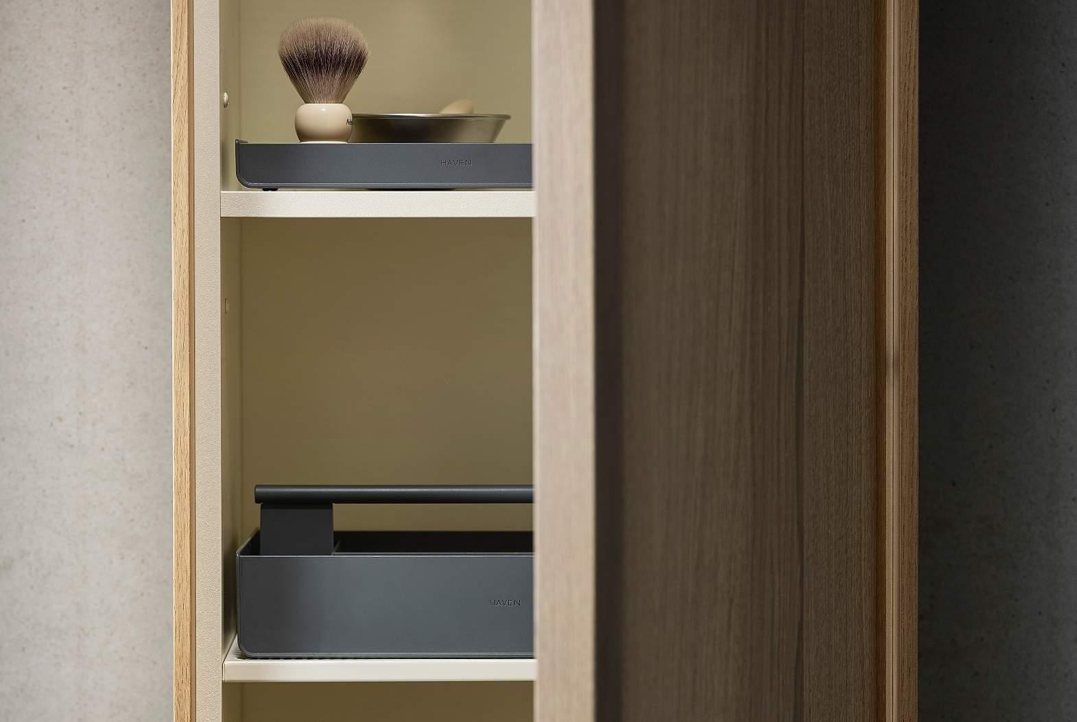 HAVENS SÆRPREG LIGGER I KOMBINASJONEN AV DEN TRADISJONELLE YRKESSTOLTHETEN OG DET NYSKAPENDE SORTIMENTET. VÅR KUNNSKAP OM TRESLAG, KONSTRUKSJON OG KVALITET MØTER EN FORMGIVNING TILPASSET MODERNE BADEROM, MED UNIKE LØSNINGER SOM GIR ET LETTANVENDELIG OG ROMSLIG MØBEL MED FLERE SMARTE FINESSER. DET SKAPER HARMONI I HVERDAGEN.