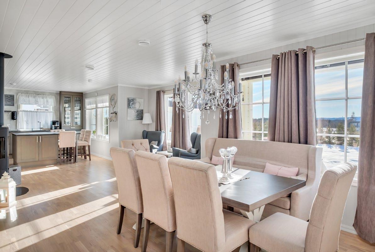 Stue og kjøkken ligger i en åpen løsning, men kjøkkenet er allikevel noe skjermet fra stua da det er plassert i vinkel. Utstikkeren fra kjøkkenbenken vil fort bli til en yndet plass for enkle frokoster eller en plass hvor barna kan sitte og gjøre lekser mens du lager middag. I den åpne løsninga har du muligheter for å få plass til både spisebord, sofagruppe og TV-krok. I enden av stua er det skyvedør ut til en overbygd terrasse og videre ut til hagen. Utfyllende informasjon fås ved kontakt med selger.