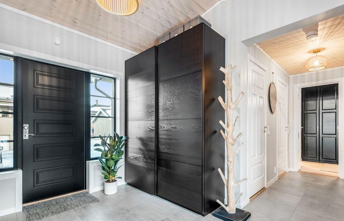 En praktisk utformet bolig med god planløsning, som vil være med på å gjøre hverdagen enklere. Hele fasaden ved inngangspartiet er overbygd. Plasseringa av bad og vaskerom på hver sin side av inngangsdøra er en løsning du kommer til å sette pris på når du, eller barna, kommer inn fra trening eller utelek. Med umiddelbar tilgang til grovgarderobe og toalett, slipper man å trekke langt inn i gangen, og du slipper unødige runder med gulvvask.