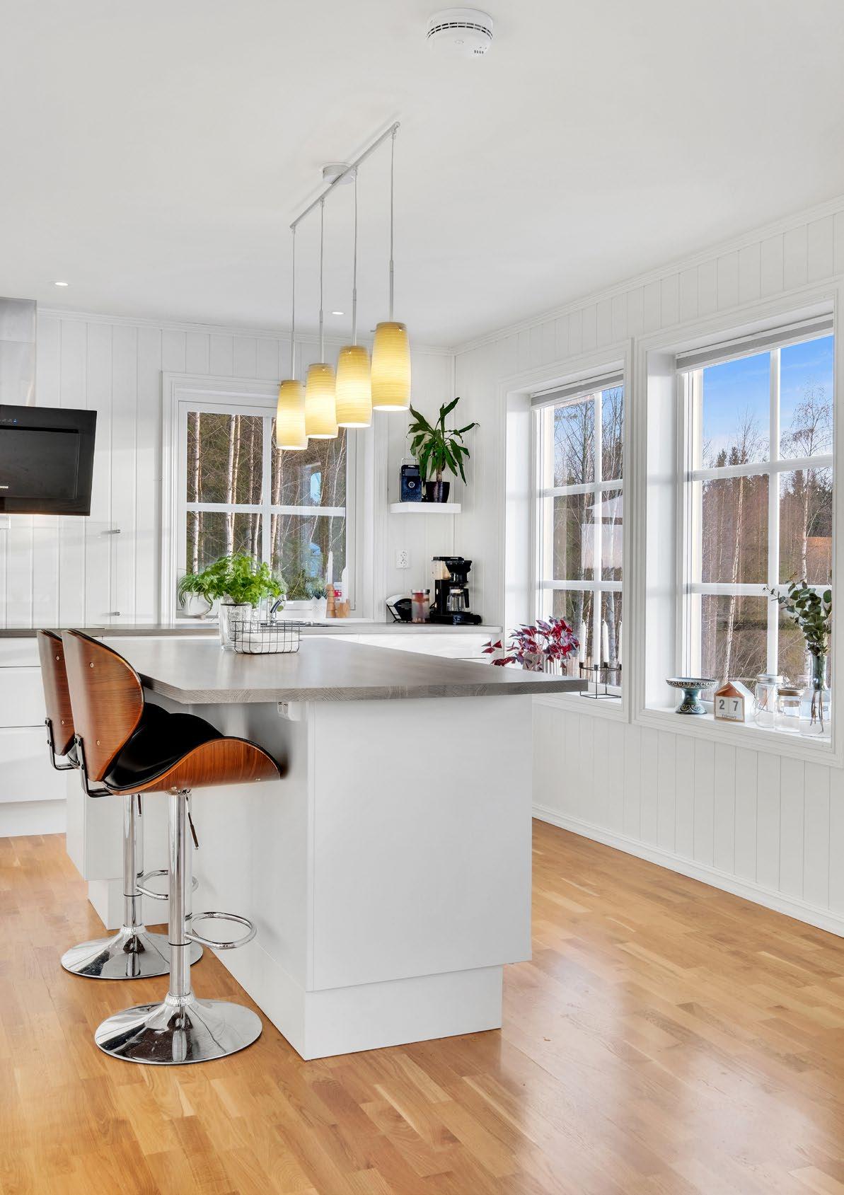 Kjøkkenet er lyst og luftig med god plass til spisebord. En kjøkkenøy, som i mange hjem har blitt samlingspunkt nummer én, kan f.eks brukes av barna til leksegjøring mens du lager middag. En dobbel verandadør slipper inn mye lys og gir enkel adkomst til hagen når middagen skal nytes ute på varme sommerdager. Stua ligger innenfor kjøkkenet og har plass til en stor sofakrok og ev en mindre sittegruppe.