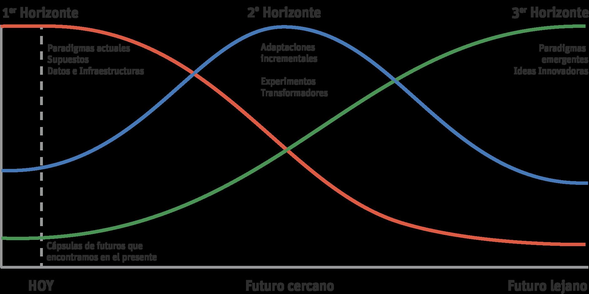 Para la co-creación de estas visiones de futuros nos apoyamos en el modelo de 3 horizontes de Bill Sharpe, desarrollado por el International Futures Forum1 con sede en Sudáfrica (Sharpe, 2013; Sharpe et al., 2016) y se está usando como herramienta en muchos contextos transformadores (Wahl, 2016).