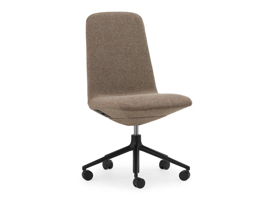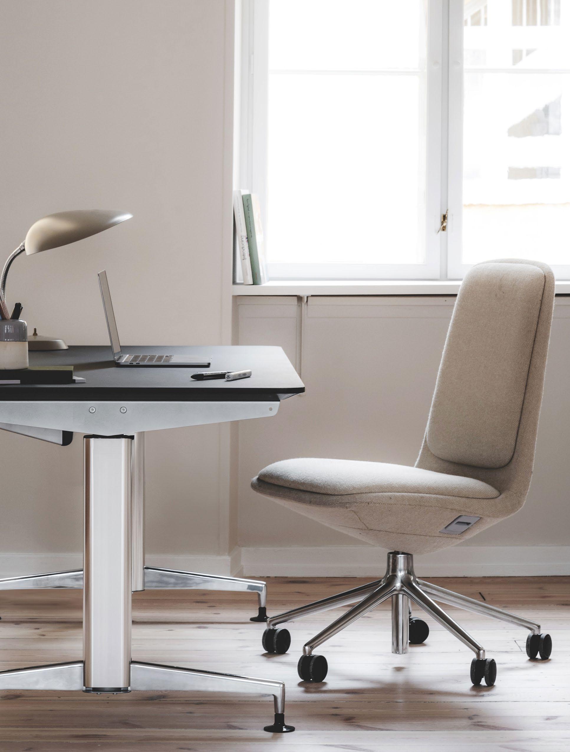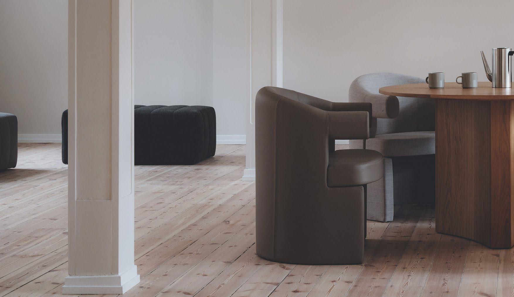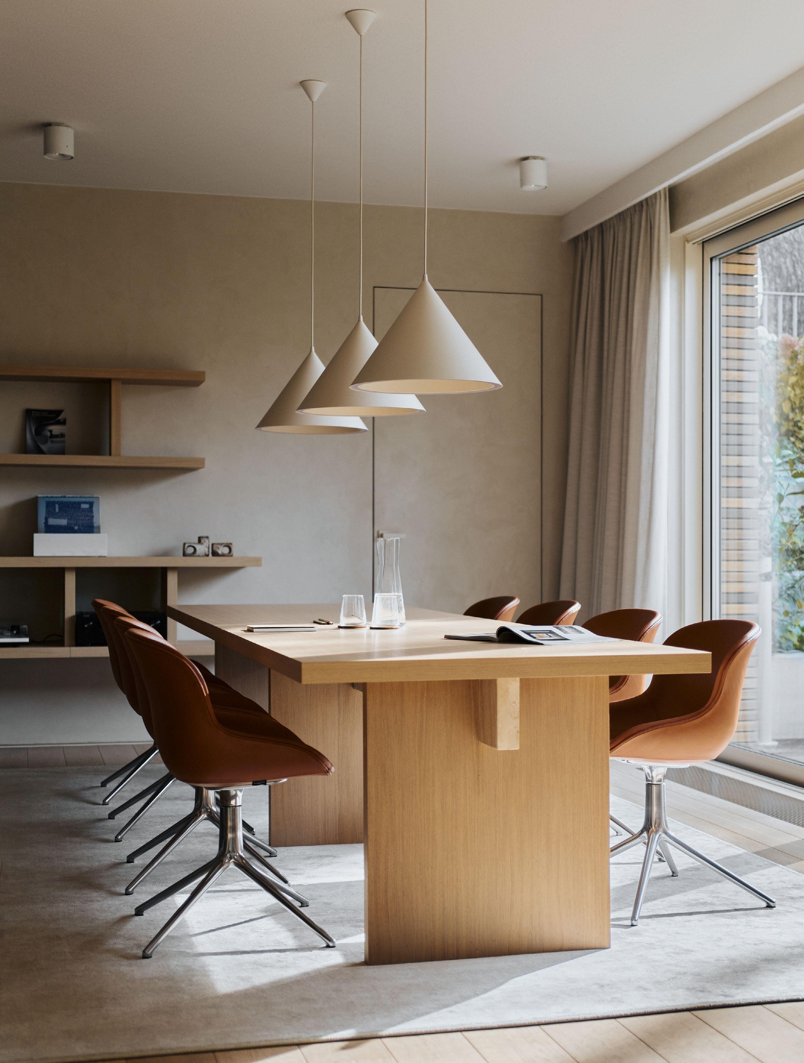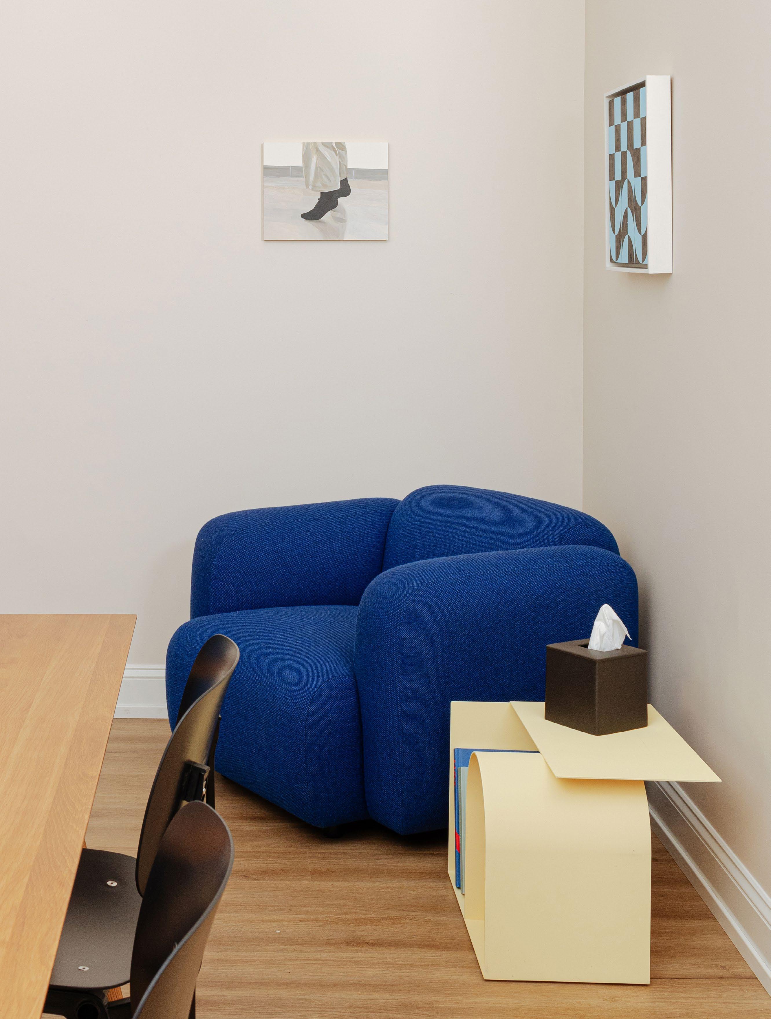 The office is exclusively furnished with Normann Copenhagen designs, including the versatile Off Chair, the cozy Burra Chair, the elegant Swell Sofa, and the stylish Scene Pouf. Complemented by the timeless Bue Table and Plank Bookcase, the space is thoughtfully crafted to foster a serene and productive work environment.