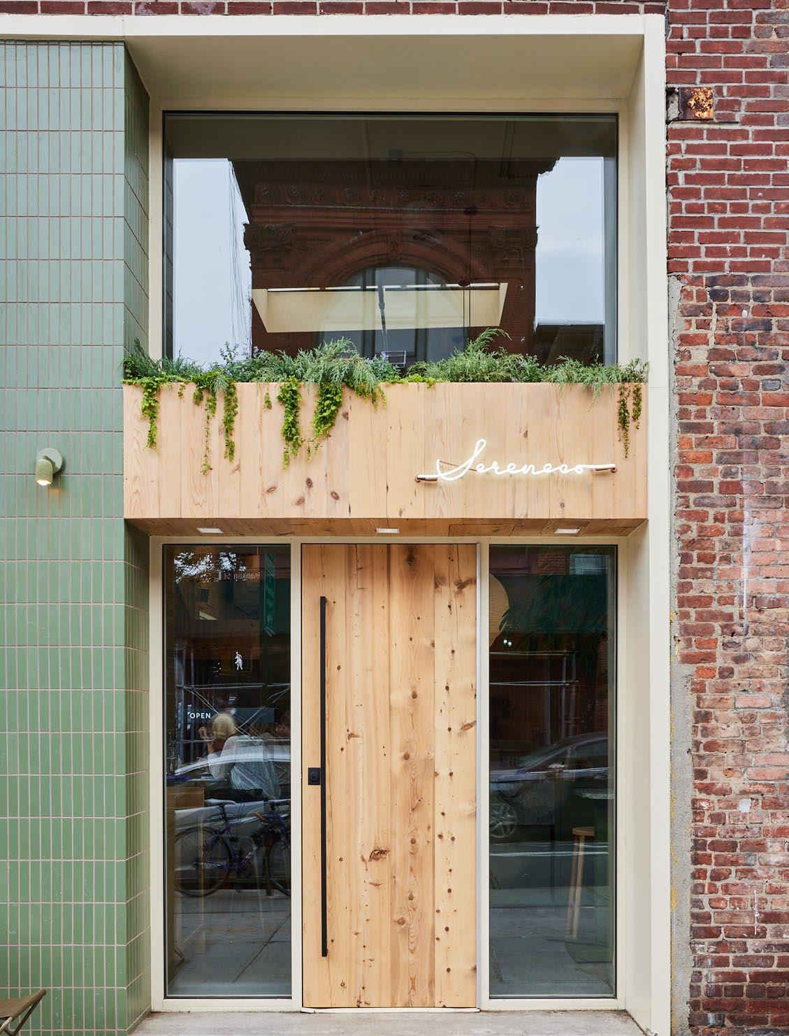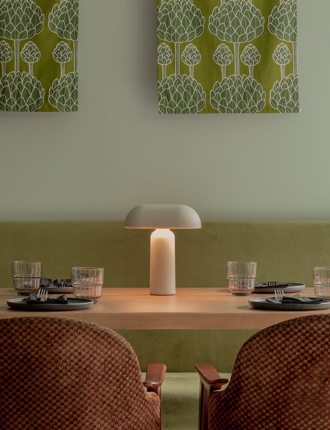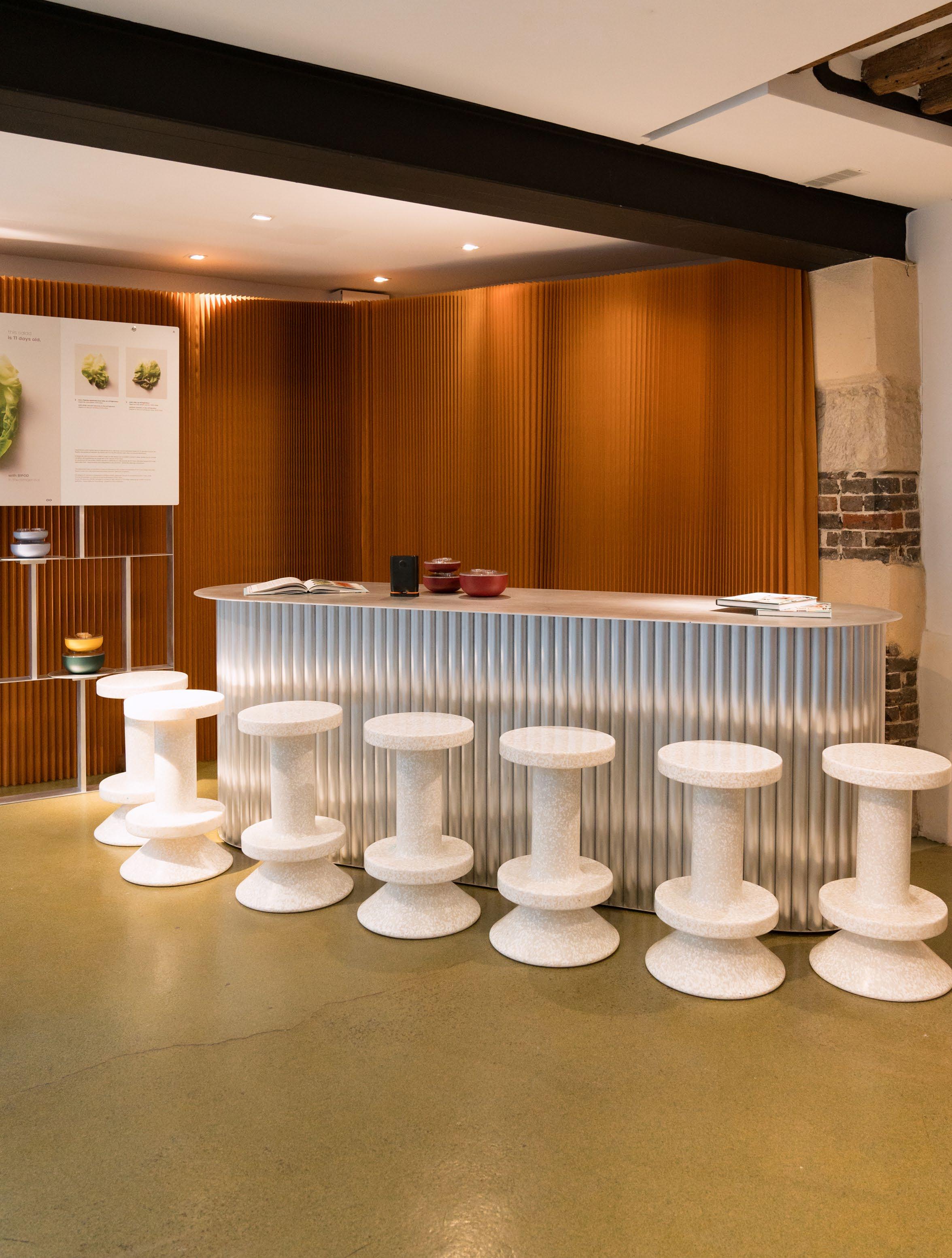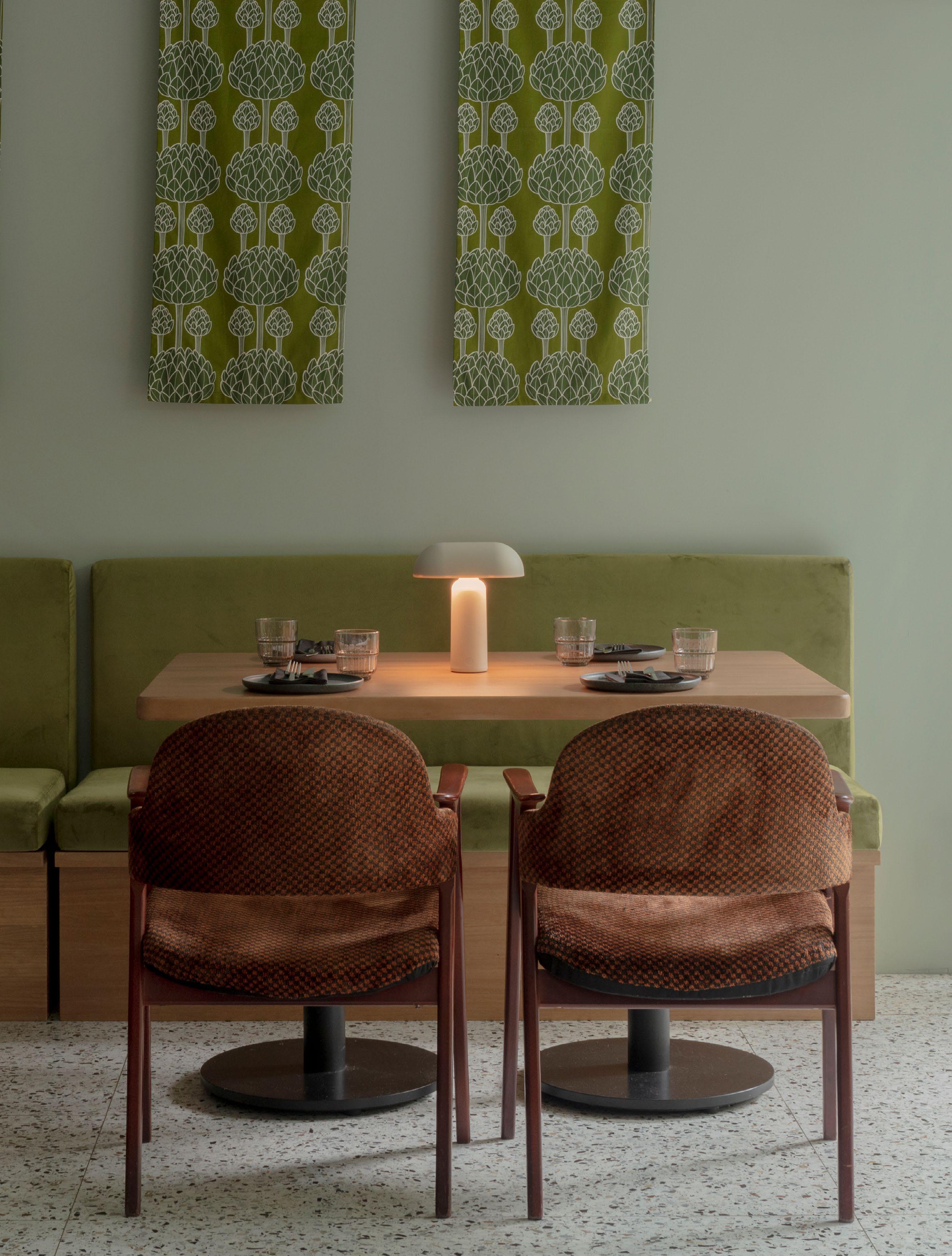 Elevated planting, earthy tones and natural materials are all found inside this restaurant, which transitions from day to night with ease. The interiors were designed to create a connection to nature with the focus always being “experience over image.” The bar, furnished with Hyg Barstools in a subtle olive shade, serves as the aesthetic center of the space; with a sculptural centerpiece meant to invoke a hearth.
