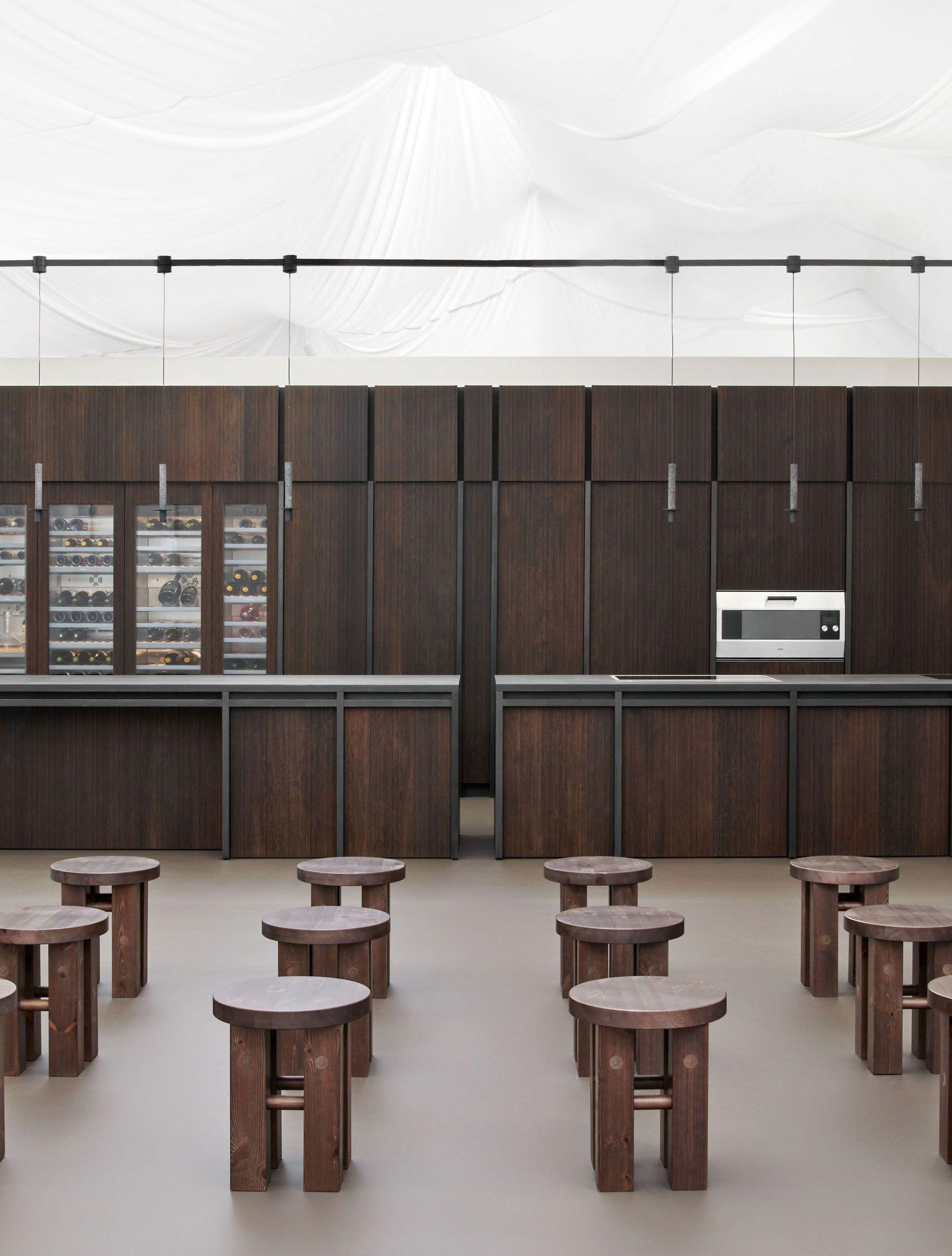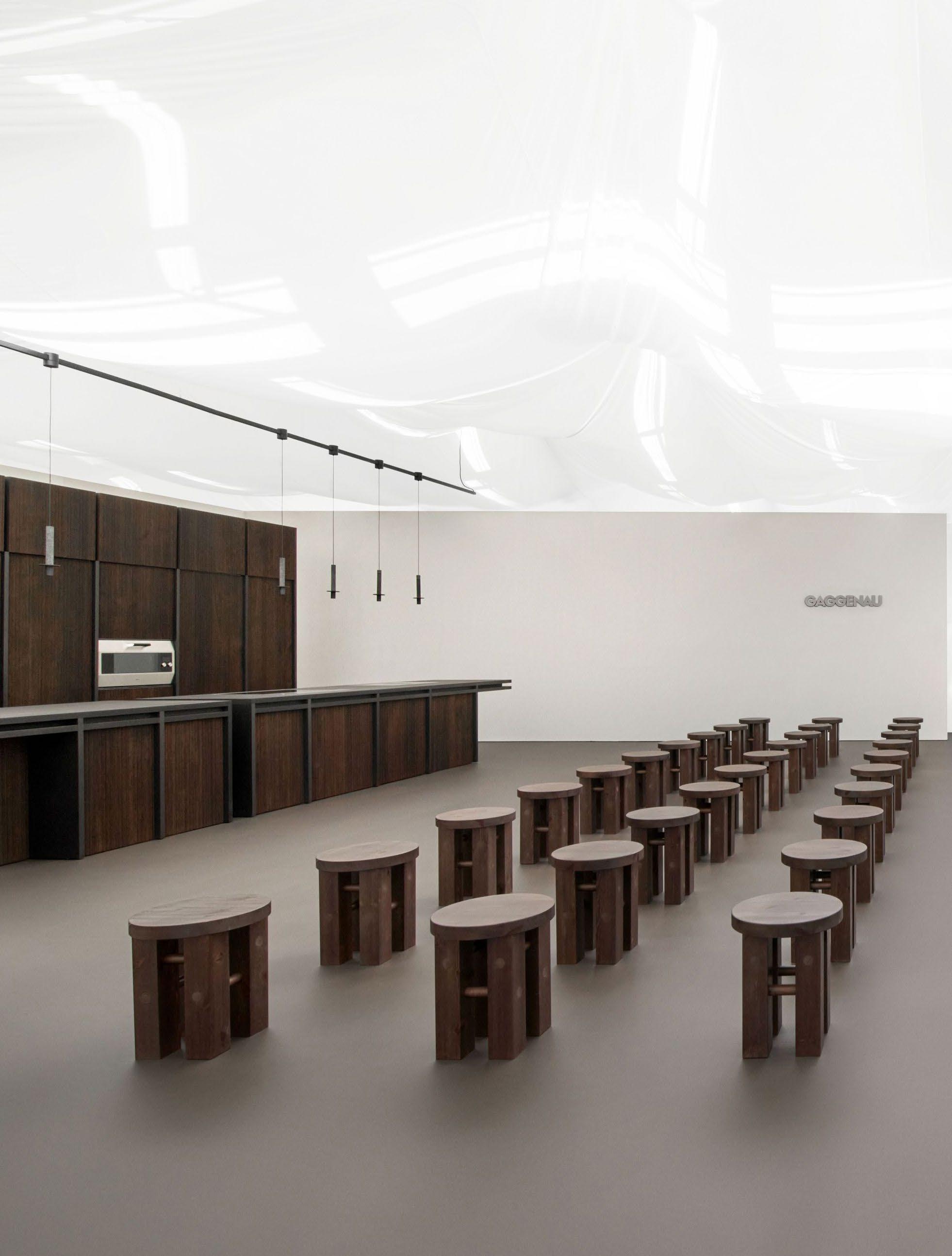 Gaggenau, the luxury brand renowned for professional-grade home appliances, presented ‘The Elevation of Gravity’ at Fuorisalone Milan in 2024. Hosted at the iconic Villa Necchi Campiglio’s glass pavilion, the installation offered a unique spatial experience designed to connect and inspire the architecture and design community, furnished with Fyr Stools by Normann Copenhagen.