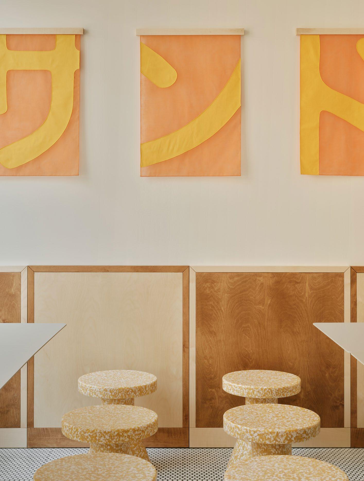 Sando is a Japanese inspired burger bar located in Geneva, Switzerland. The spatial design draws on references from Japanese culture with the concept of “boro boro”, which refers to materials that have been stitched together to create a multi-layered patchwork effect, at the forefront of the design process. Contributing to the warm, inviting color palette, yellow Bit Stools by Normann Copenhagen have been featured throughout the space.