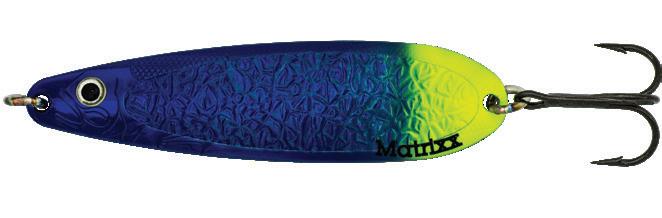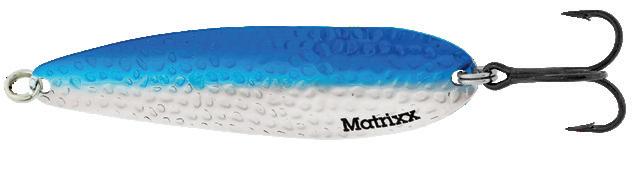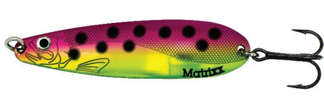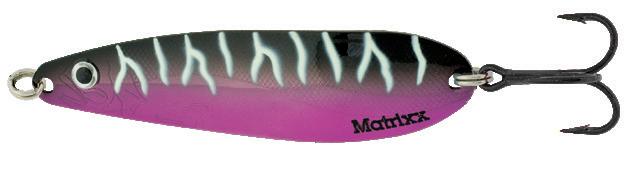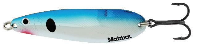 The Matrixx gets a tasty garnish! Accentuated dot patterns and accented with pearlescent tape. Flaw-free silver plating, and hand painted details along with engraved life-like fish pattern. Super-sharp Black-Nickel VMC® hooks are long-standing features of this erratic fluttering action trolling spoon. UV Enhanced finishes make the Matrixx more visible in low light at deeper depths.