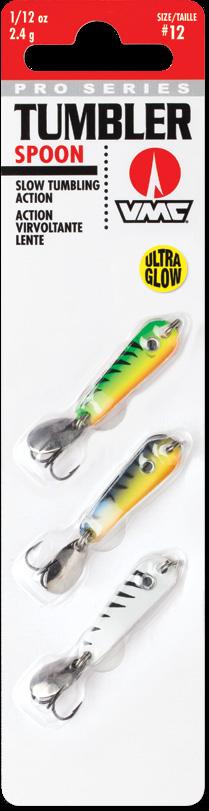 The Tumbler Spoon has a unique “knuckle” bend that offers a slow tumbling action. Small attractor blade adds flash. VMC ® Ultra Glow colors last up to 15 minutes. UV finishes, natural baitfish patterns and holographic eye.