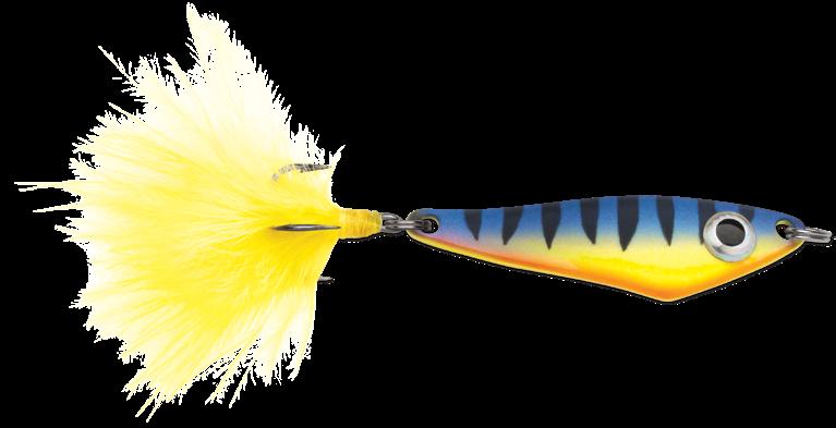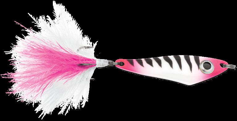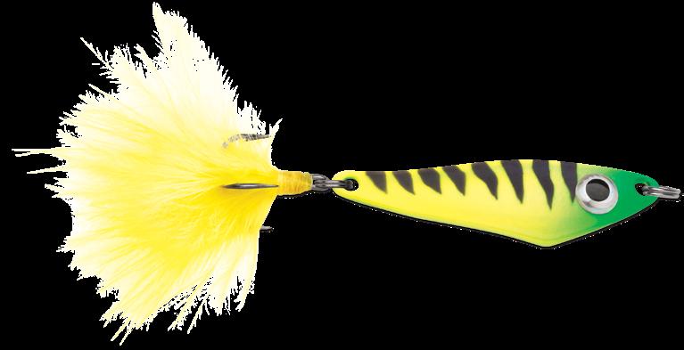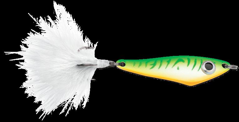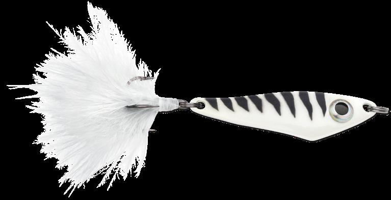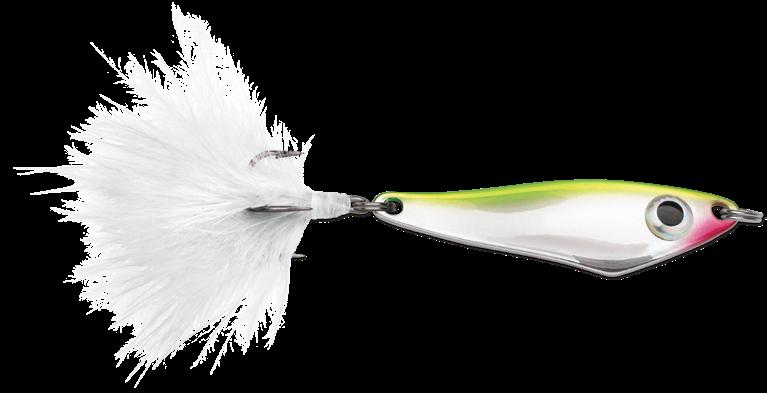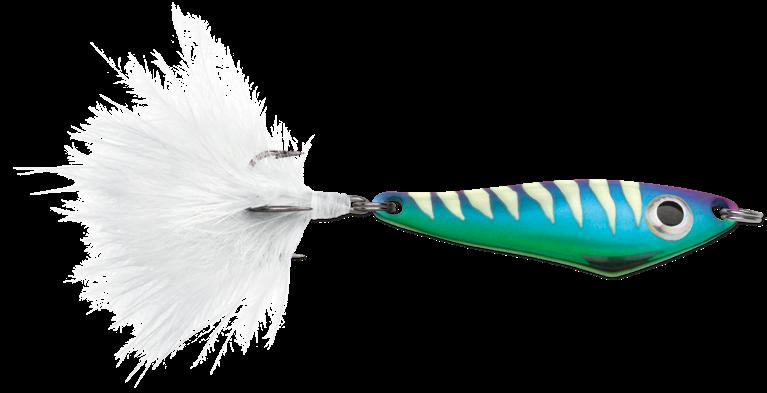 When the Hatchet Spoon hits the water, its intense rapid start & fluttering energy deliver maximum action and vibration, grabbing the attention of aggressive fish. We’ve dressed this spoon with a Marabou teaser tail, which conceals a super sharp VMC ® treble hook. Oversized holographic eye and a variety of UV, polished metal attractor and custom color patterns. Ultra Glow colors last up to 15 minutes.