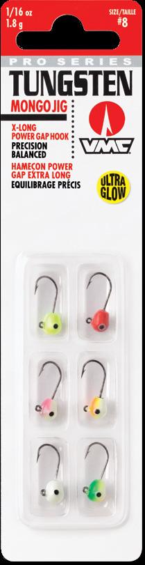 Micro profile with attitude. The heavy-duty VMC ® Tungsten Mongo Jig Head adds super-fast drop, delivering your presentation to the strike zone faster with greater efficiency. Pre-rigged with a Nymph soft bait. Exclusive VMC ® Power Gap hook delivers a wider round gap compared to other competitive micro jigs, greatly increasing your hook rate percentage.