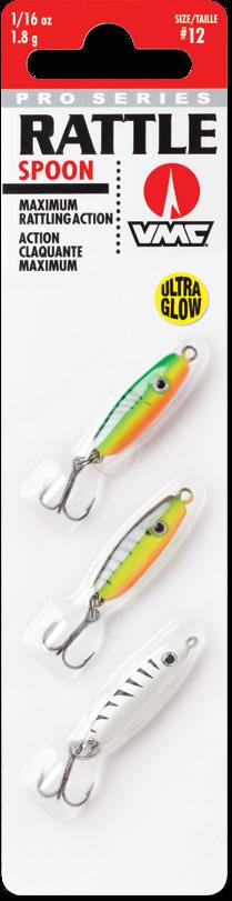 The VMC ® Rattle Spoon has an unmatched brass rattle chamber with multiple beads. The chamber allows the angler to impart sound with minimal jigging while maintaining action. A wide variety of colors in UV, natural baitfish, holographic finishes and VMC ® Ultra Glow pigments that last up to 15 minutes.