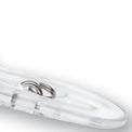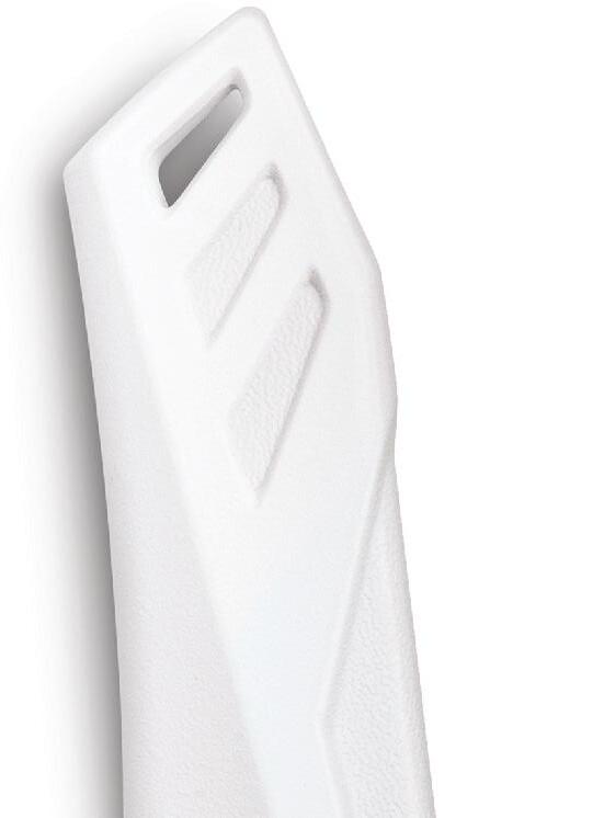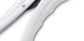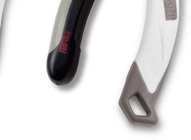 Serrated cutting edge is specially designed to grip and hold tough braided line for easy, non-slip cutting. Stainless steel construction with oversized finger holes for ease of use. Choose White or Black.