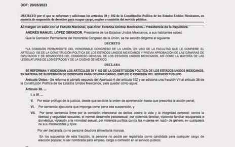 MÉXICO._ La Secretaría de Gobernación publicó el lunes en el Diario Oficial de la Federación la declaratoria de constitucionalidad del paquete de ocho reformas legales y constitucionales, entre las que se encuentran el dictamen conocido como “Ley 3 de 3”, en materia de suspensión de derechos, para obtener candidaturas, ocupar cargos públicos o de elección popular, a personas sentenciadas por violencia de género, familiar, sexual o política, así como a quienes sean deudores alimentarios. El 24 de mayo, la Comisión Permanente del Congreso de la Unión realizó la declaratoria de constitucionalidad de la “Ley 3 de 3”, ello luego de su aprobación en 24 congresos locales: Baja California, Baja California Sur, Campeche, Coahuila, Colima, Chiapas, Chihuahua, Durango, Guanajuato, Guerrero, Estado de México, Morelos, Nayarit, Puebla, Quintana Roo, Sinaloa, Tabasco, Tamaulipas, Tlaxcala, Veracruz, Yucatán, Zacatecas y Ciudad de México.