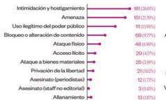 “En 2022, al igual que en los últimos tres años, las agresiones más comunes contra periodistas y medios de comunicación fueron: intimidaciones y hostigamientos, con 181 casos; amenazas, con 151 casos, y uso ilegítimo del poder público, con 111 casos. Estas tres categorías corresponden a más del 63 por ciento del total de ataques documentados en el año”, señaló Artículo 19. Con 12 homicidios de periodistas cometidos en posible vínculo con su labor profesional durante 2022, México se posicionó como el país más letal para la prensa en el conti-
