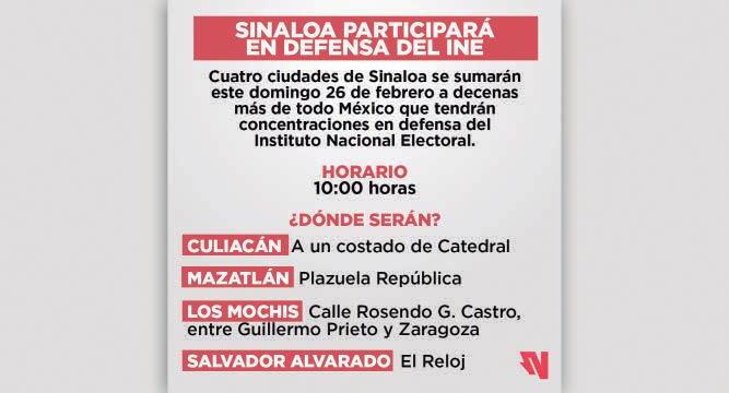 Cuatro ciudades de Sinaloa se sumarán este domingo 26 de febrero a decenas más de todo México que tendrán concentraciones en defensa del Instituto Nacional Electoral.