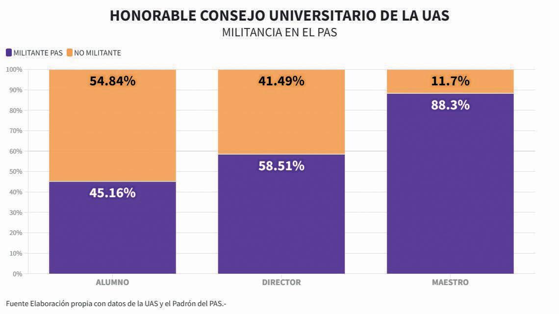 El predominio de la militancia partidista por el PAS se mantiene en todas las Unidades Académicas Regionales de la Universidad, siendo la Zona Sur la más alta con 75 por ciento de los integrantes con afiliación al partido cuenista, seguido de la zona norte con 71 por ciento , luego la zona centro norte con 60 por ciento y al final la zona centro con 57 por ciento.