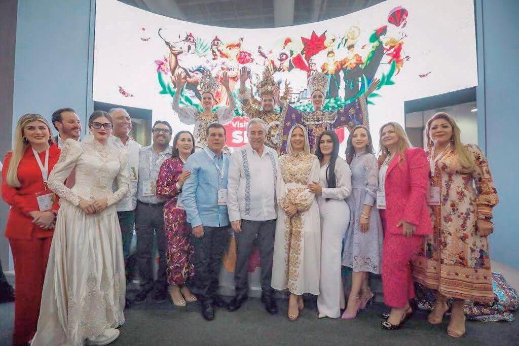 El Gobernador Rubén Rocha Moya, alcaldes y funcionarios estatales, acompañados del cortejo real del Carnaval de Mazatlán, inauguran el stand de Sinaloa en el Tianguis Turístico 2023 en la Ciudad de México.