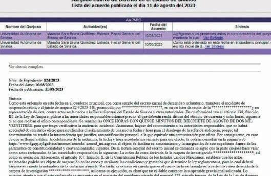 Un Juez federal le negó la suspensión provisional a la Universidad Autónoma de Sinaloa contra una orden y ejecución de cateo por parte de la Fiscalía General del Estado, esto bajo el cuadernillo 824/2023 en el Juzgado Cuarto de Distrito.