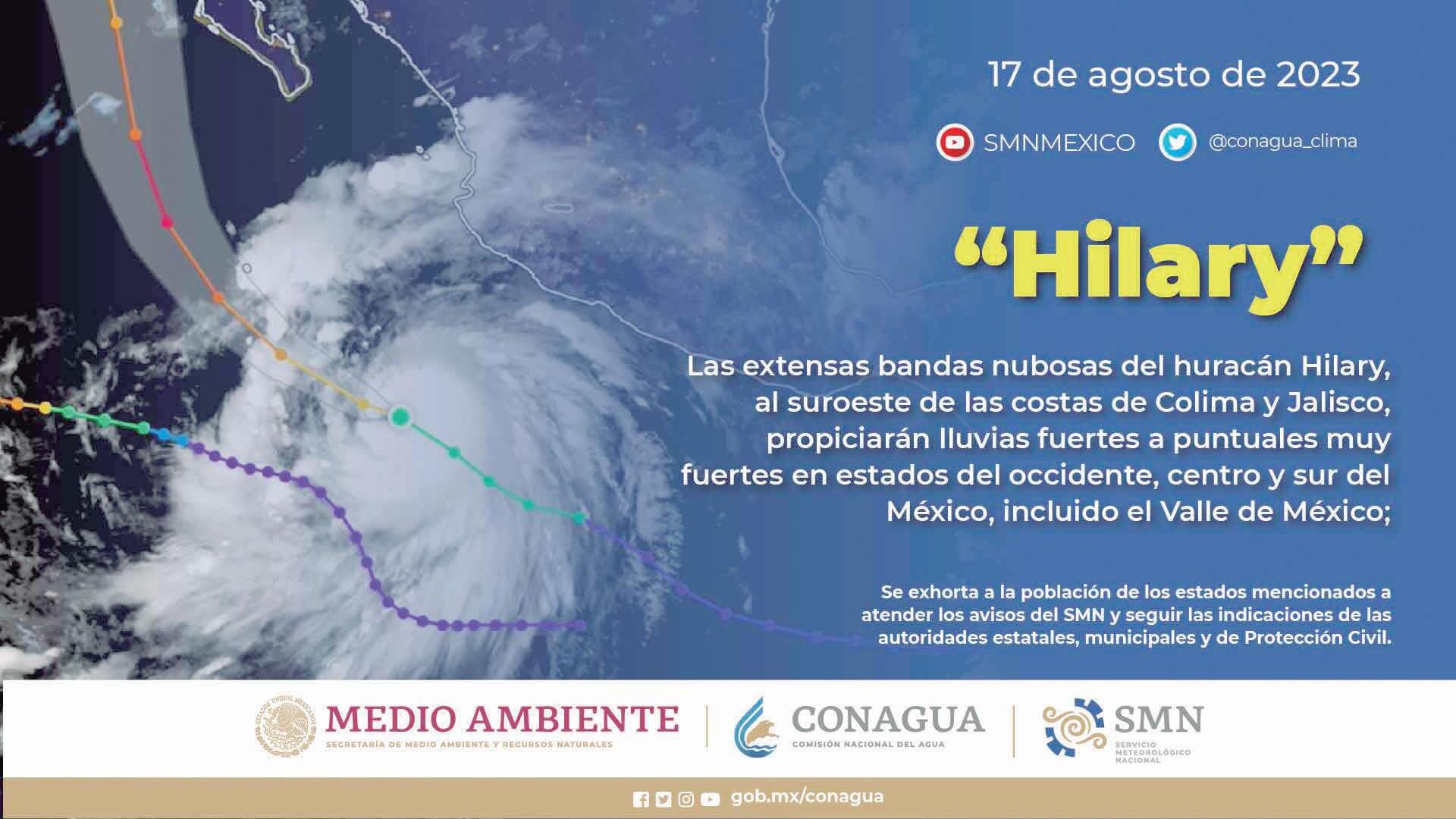 “Hilary” golpeará la región de Los Cabos el próximo domingo como categoría 2, sin embargo se espera que durante este viernes y sábado el huracán alcance la categoría 4. “Hilary se localiza al sur este de Colima y continuará desplazándose hacia el noroeste y fortaleciéndose para este jueves alcanzar la categoría 3 y mañana (hoy) será un gigante de categoría 4, su trayectoria indica que tocara la península de Baja California a la altura de Guerrero Negro como huracán categoría 2 el próximo domingo, pero mucho cuidado amigos de la zona de Los Cabos, Todos Santos, que estará muy cerca de la línea de costa como categoría 4 dejando muchas lluvias y vientos, además de una marea de hasta