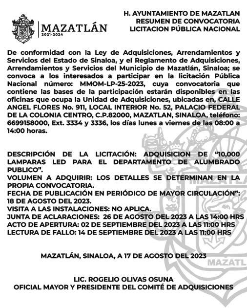 Luis Guillermo “El Químico” Benítez Torres fue imputado por el delito de desempeño irregular de la función pública por la compra irregular de luminarias a la empresa Azteca Lighting cuando era Presidente Municipal de Mazatlán. La Fiscalía General del Estado le acusó tanto por el contrato de 34 millones 971 46.64 pesos por 198 lámparas y también por el contrato de 400 millones 864 mil 204.47 pesos por 2 mil 129 luminarias, ambos por adjudicación directa. De la misma manera, el ex Tesorero, Jesús Javier Alarcón Lizárraga, fue acusado por los dos contratos. El resto de ex funcionarios, Javier Lira González, ex Oficial Mayor; José de Jesús Flores Segura, ex Secretario; y José Daniel Tirado Zamudio, ex director de Obras Públicas del Ayuntamiento porteño, fueron señalados por el primer contrato.