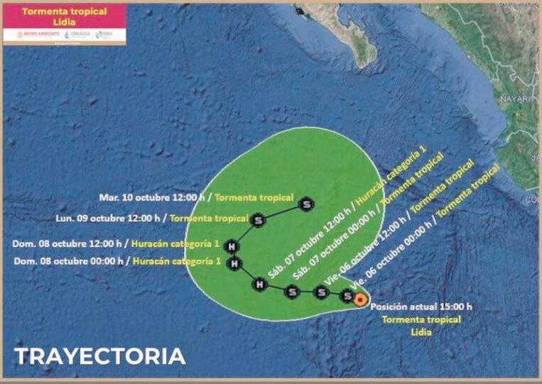 Pronosticó que para las 12:00 horas del próximo sábado 7 de octubre Lidia se intensificará a huracán de categoría 1 en la escala de Saffir-Simpson, por la velocidad de sus vientos, y se localizará a 785 kilómetros al sur-suroeste de Cabo San Lucas, BCS.
