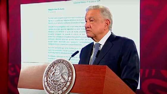 MÉXICO._ El Presidente Andrés Manuel López Obrador dio a conocer el martes la carta que le envió a César de Castro, abogado de Genaro García Luna, ex Secretario de Seguridad Pública durante el Gobierno de Felipe Calderón.