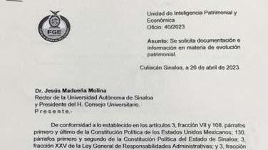 La Unidad de Inteligencia Patrimonial y Económica de la Fiscalía General del Estado solicitó desde el miércoles a la Universidad Autónoma de Sinaloa un informe sobre la evolución patrimonial del actual Rector Jesús Madueña Molina. El documento, al que Noroeste tuvo acceso, fue presentado y recibido este miércoles poco antes de mediodía y señala que se “... instruya lo necesario para que proporcione a la brevedad sus correspondientes declaraciones patrimoniales y de intereses relativas a los últimos 5 años, a la fecha del presente oficio, a fin de que estemos en condiciones de realizar el procedente análisis”, dice el documento firmado por el titular de la UIPE, Ángel Angulo Cázarez. “... en su carácter de Rector de esa casa de estudios, al mantener el carácter de servidor público, se encuentra obligado a presentar su declaración patrimonial y de intereses, tanto en la modalidad inicial, como en la modificación”. Esta no es la primera vez que la UIPE solicita este tipo de información, después de que el Rector públicamente rechazó ser auditado por la Auditoría Superior del Estado. La anterior solicitud se dirigió para la familia Cuén Díaz que laboran en la Universidad, hijos del ex Rector Héctor Melesio Cuén Ojeda, debido a su ritmo acelerado de compra de lotes e inmuebles en los últimos 14 años.